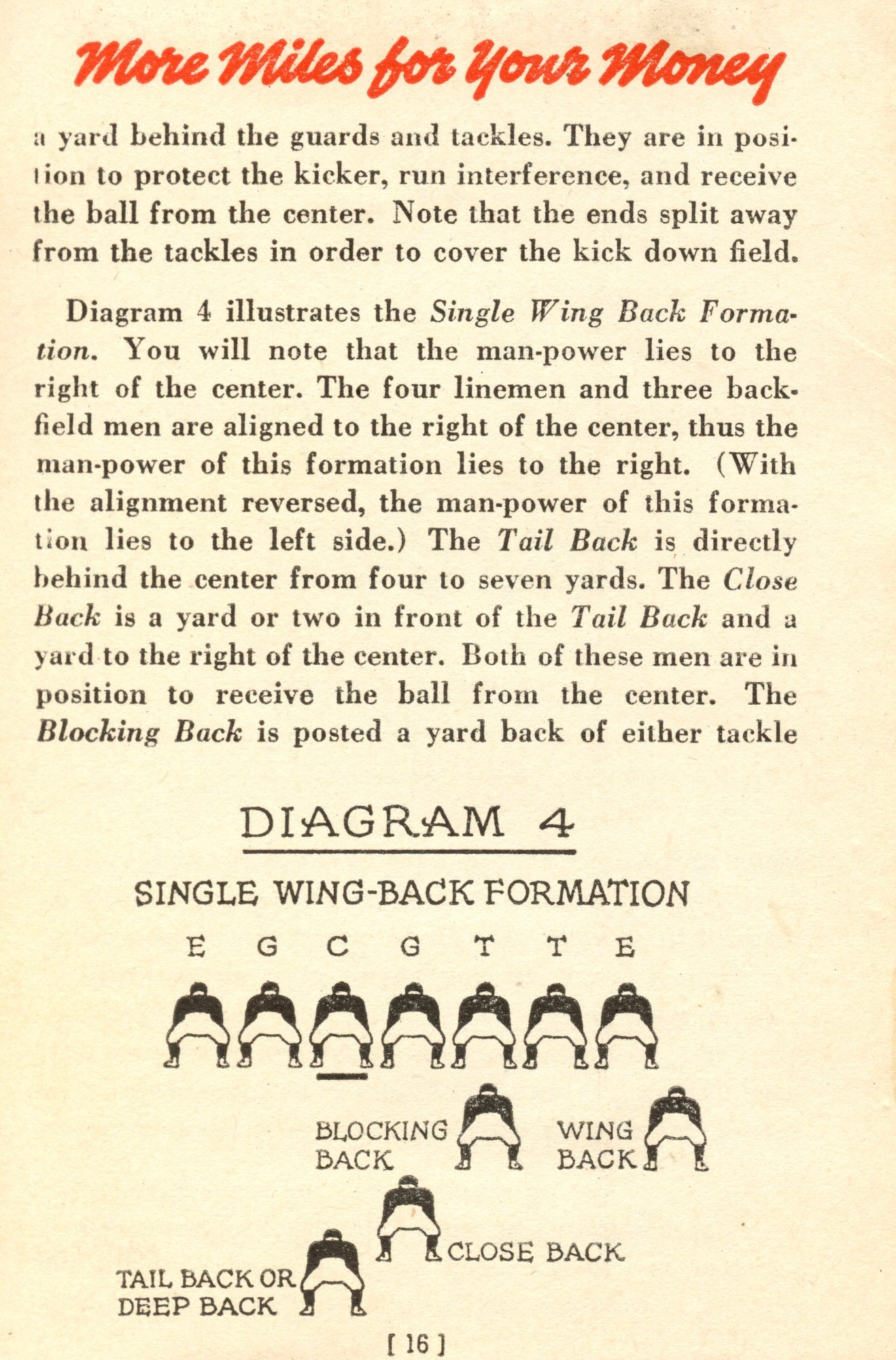 The Single-Wing formation has an unbalanced offensive line on the right and three of four backs on the right side. Power right, spinners, and misdirection were the order of the day.