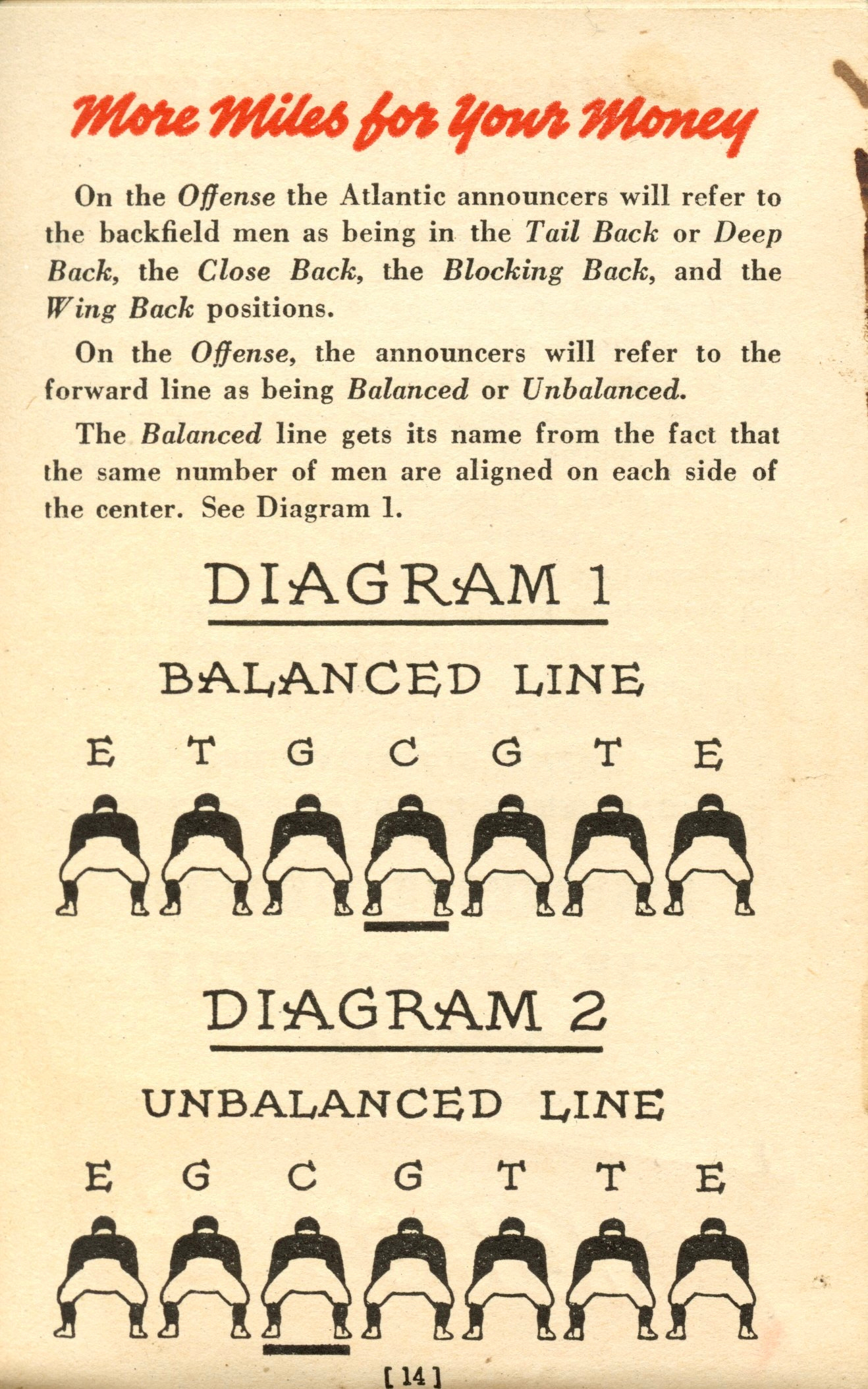They simplified things, saying there were two offenses, two defenses, and a Kicking Formation. Still, Atlantic Gas thought it was helpful to provide this background information so fans would recognize the offenses and defenses when they saw them on television. Oh, wait. There were no television broadcasts back then, so they intended the information to help radio listeners visualize the events on the field based on the descriptions provided by the radio announcers.