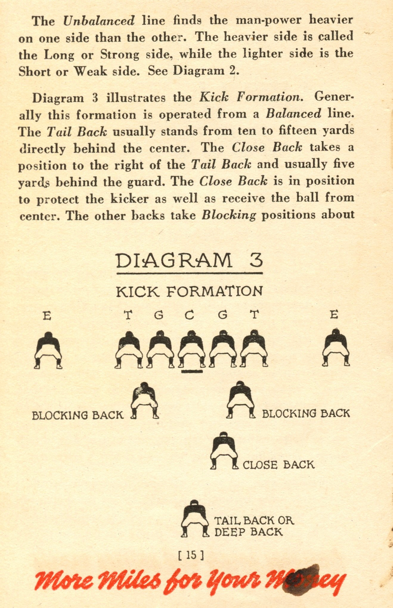 They also discussed kick formation, which meant punt formation. They retained the term “kick formation” since it used to apply to drop kicking, but drop kickers began disappearing after the ball became narrower in 1929 and 1934.