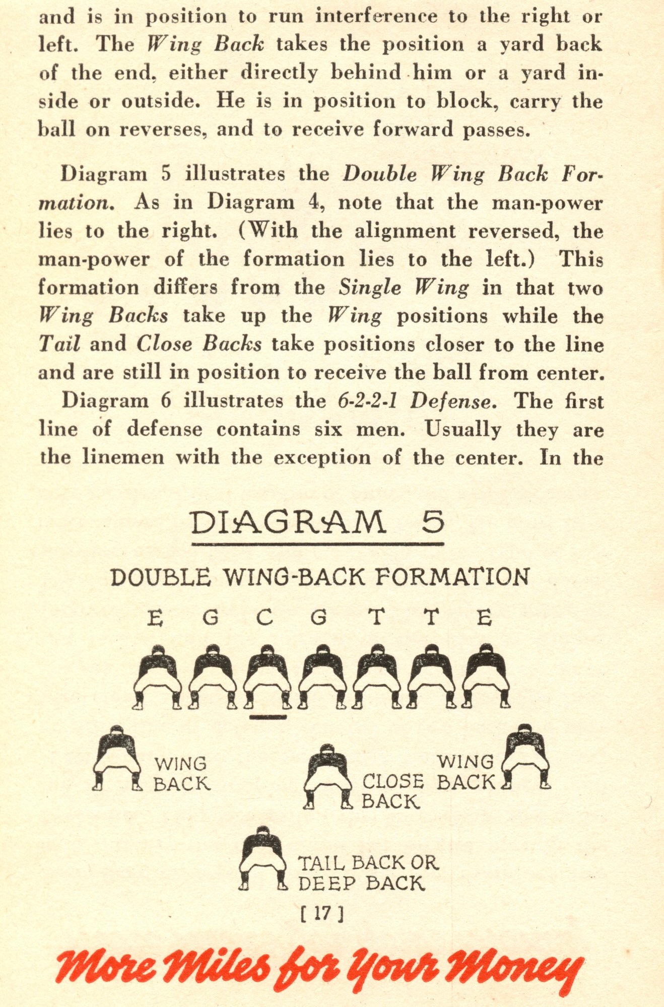 Like the Single Wing, the Double Wing formation arose in Pop Warner's mind. The football term "reverse" first showed up with the Single Wing. Notre Dame and Rockne gave us "misdirection," while "Single Wing" did not appear in the literature until Bill Roper used the term in 1928. Meanwhile, Pop Warner first used the term "Double Wing" in the early 1930s, though he successfully used the formation at Stanford in the 1920s. (Before then, Warner called it Formation B, and the Single Wing was Formation A.)