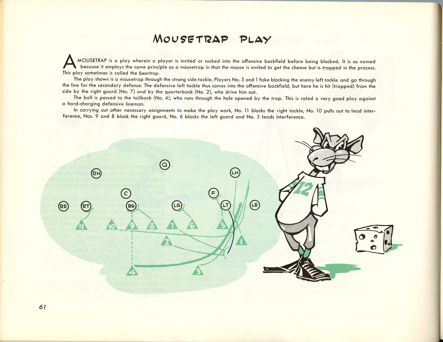 As the Single Wing Mousetrap is drawn, many would consider it to be a kickout block on a Lombardi-ish sweep rather than a trap. Still, the logic of allowing an aggressive defender to come across the line and get blasted by someone coming from a different direction remains the same.