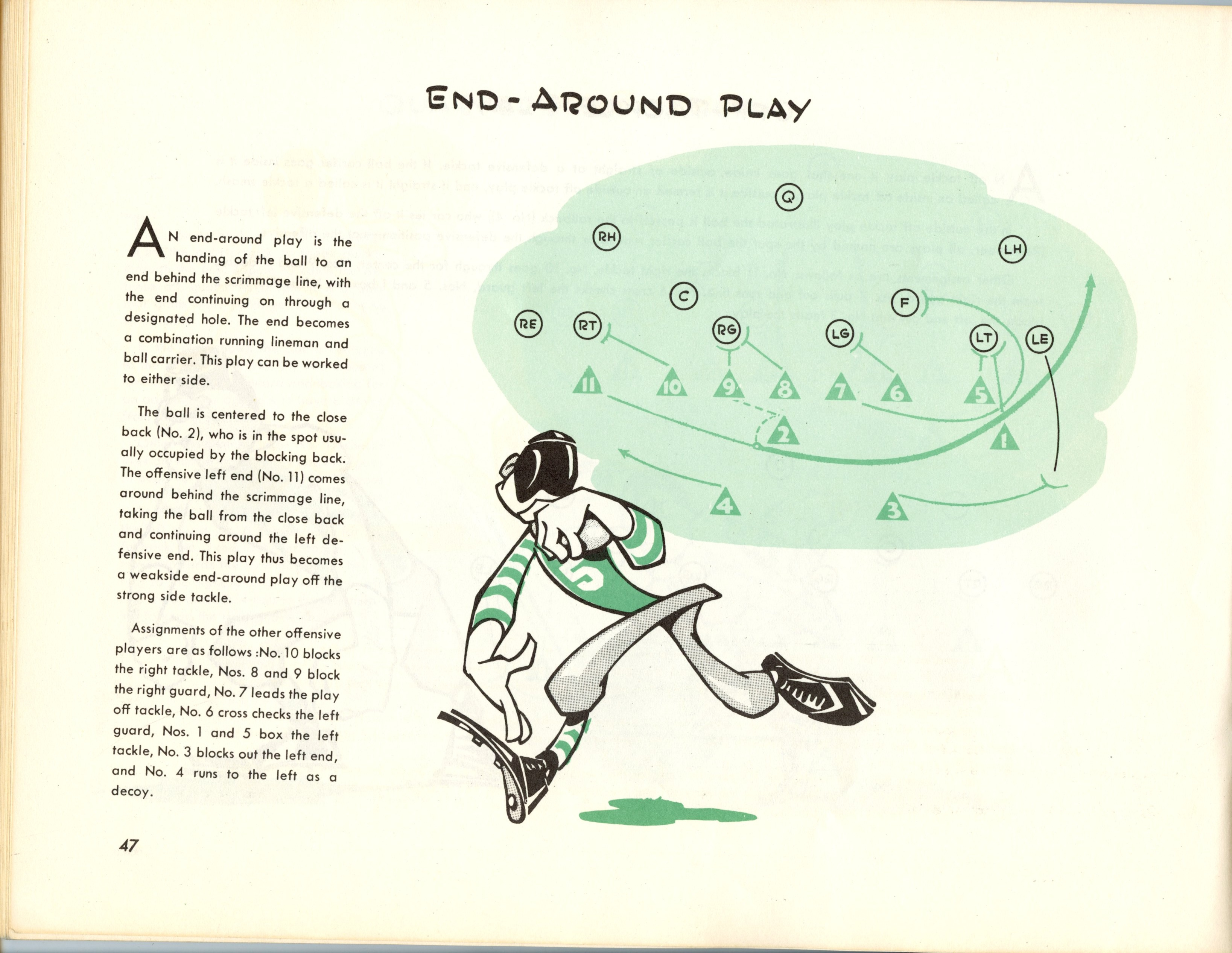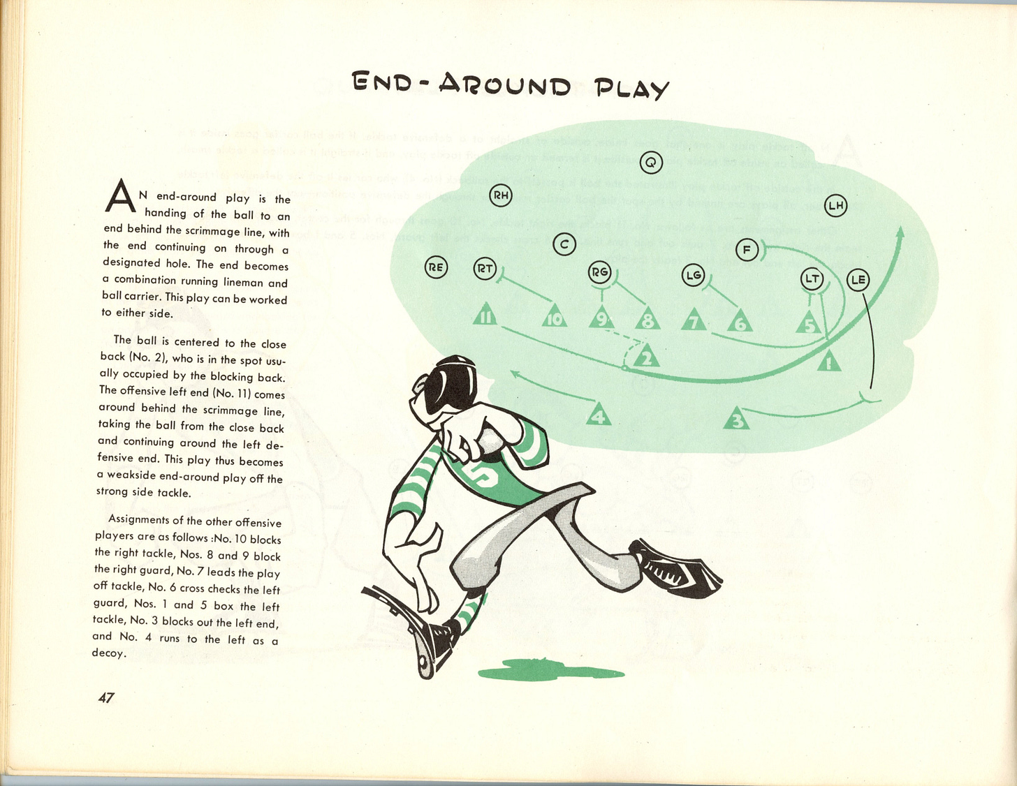 Another beauty from the 1940s or 1950s is the end around. Teams ran end and tackle arounds back in the 1890s, so they must have had some success, which, I guess, was due to the defense being confused about who carried the ball.