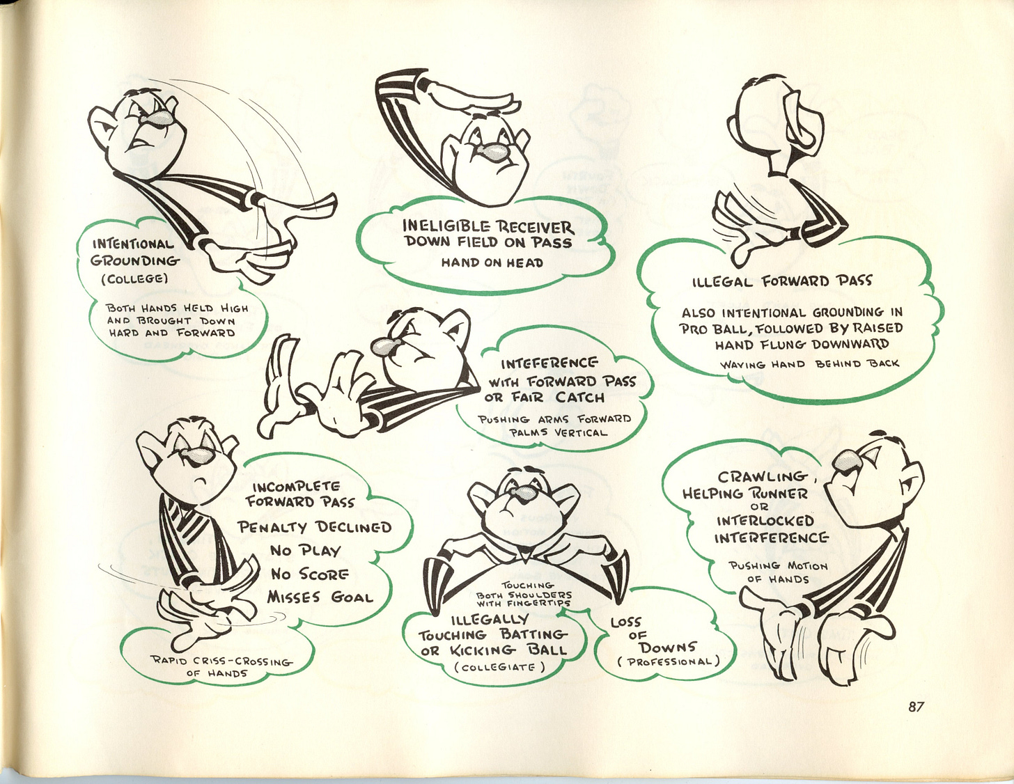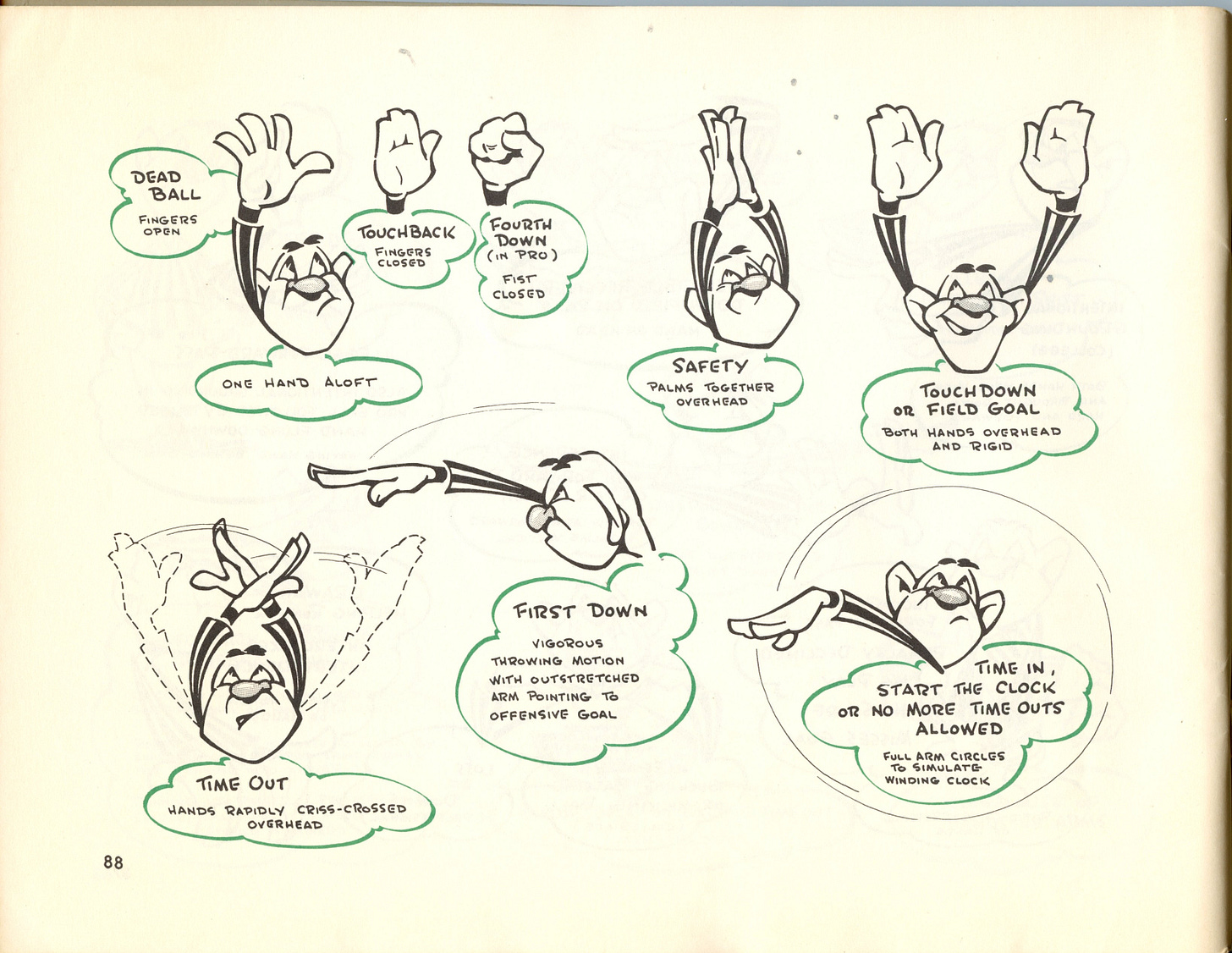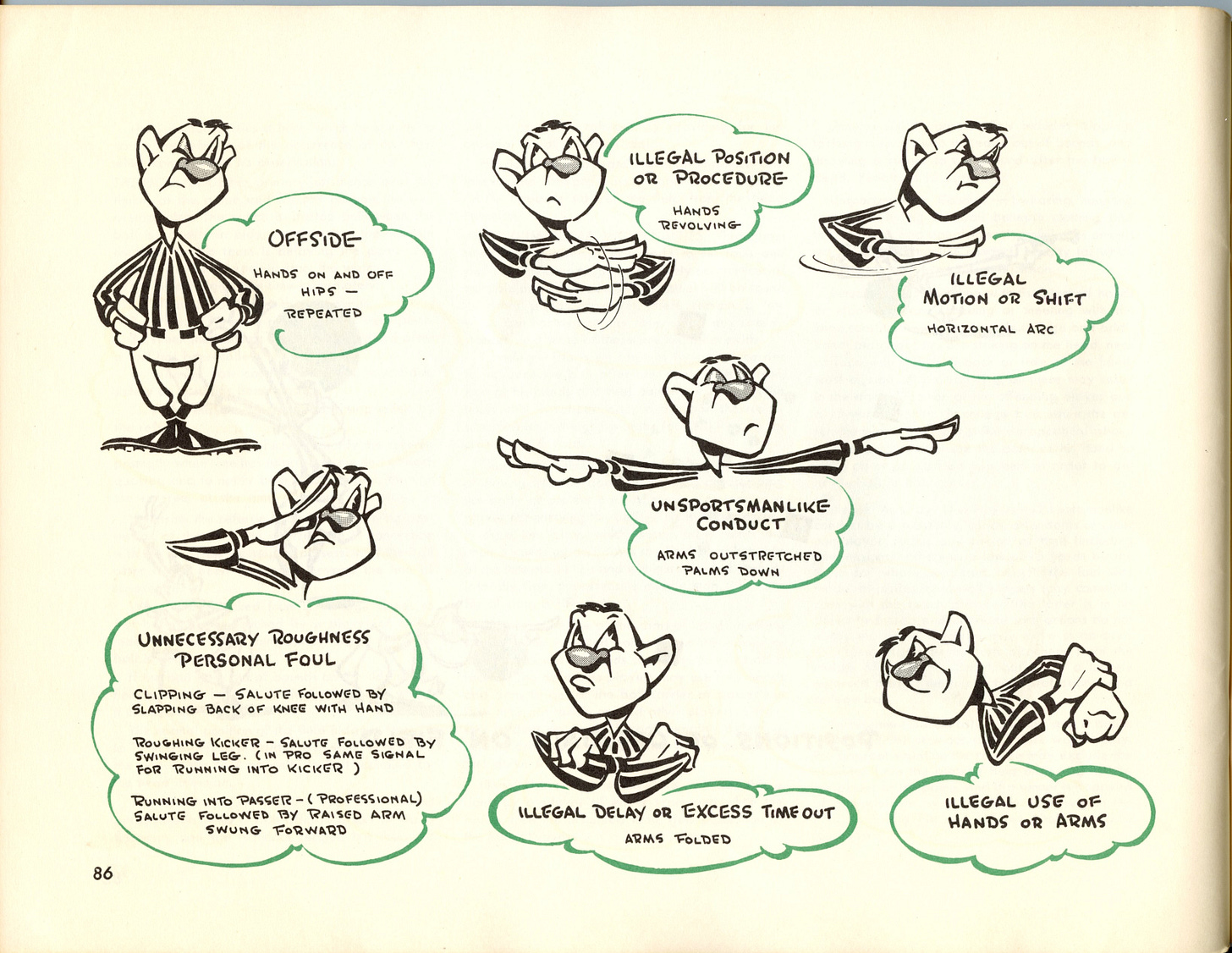 The officials’ signals as illustrated by Ted Drake are seen below. Most of the signals on the first page are the same today, but the unnecessary roughness signal has been changed and broken into different signals for each foul. They eliminated the military salute version on the signal after the American Legion complained it did not fit with the unnecessary roughness penalty.
