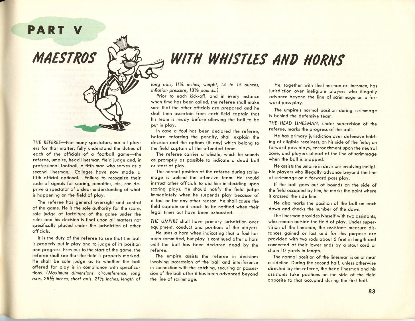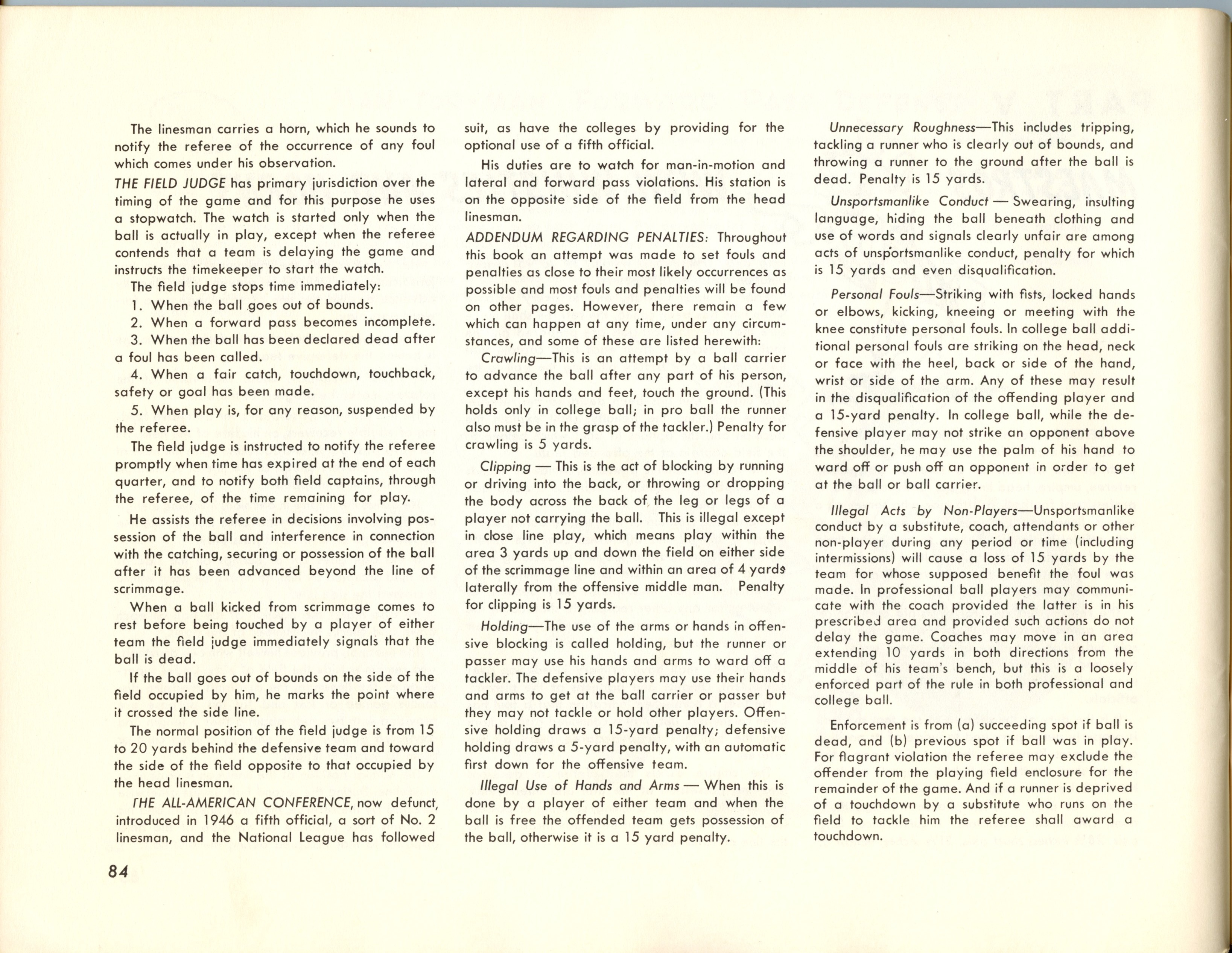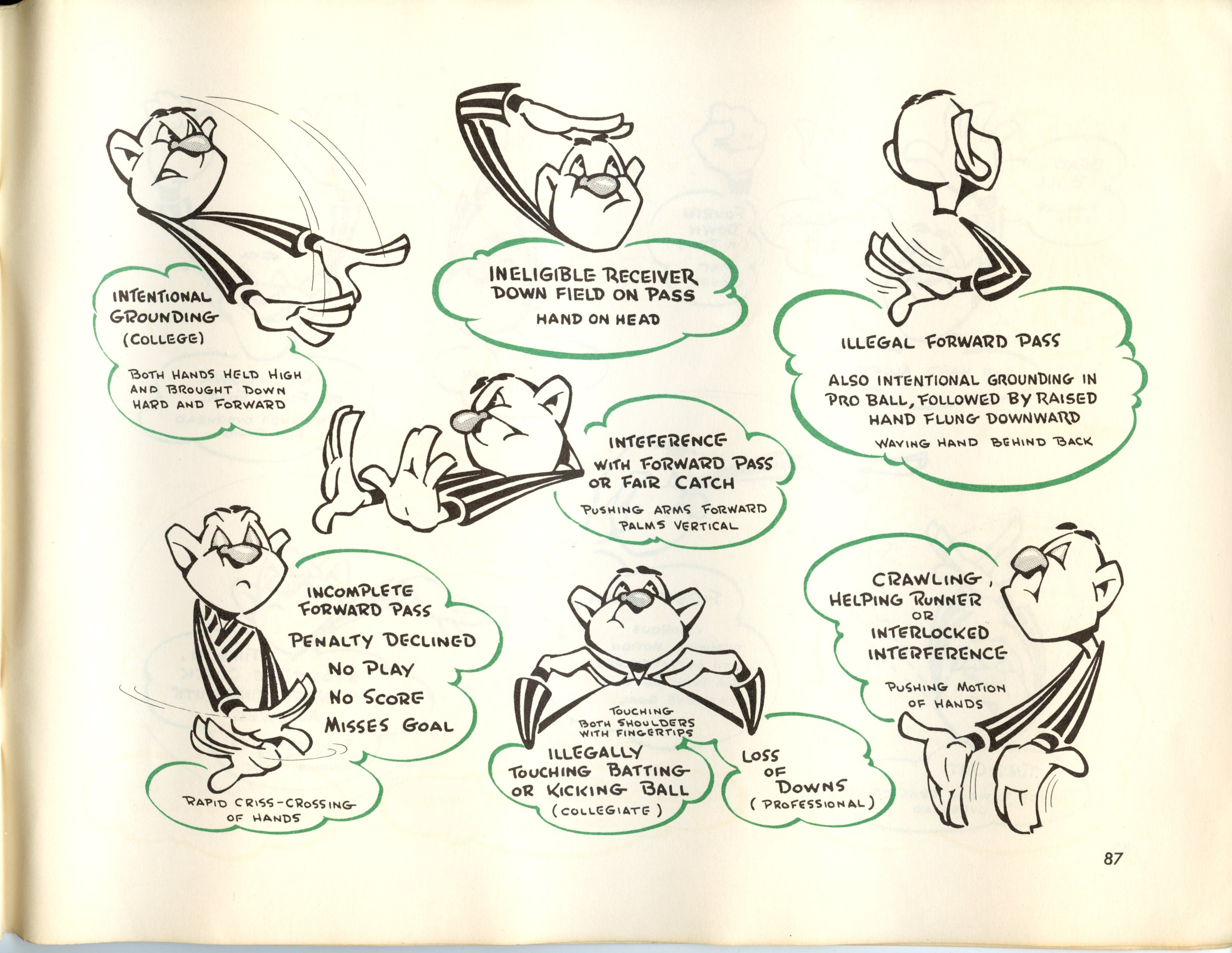 The officials’ signals as illustrated by Ted Drake are seen below. Most of the signals on the first page are the same today, but the unnecessary roughness signal has been changed and broken into different signals for each foul. They eliminated the military salute version on the signal after the American Legion complained it did not fit with the unnecessary roughness penalty.