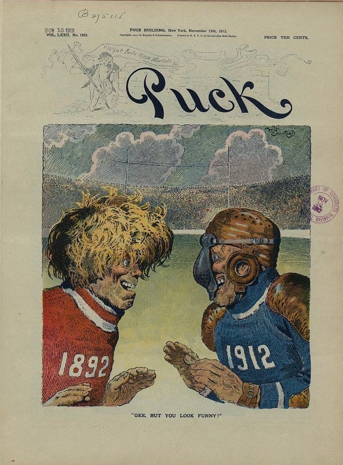 By 1912, the head protection tides had turned enough for Puck magazine to grace its cover with an illustration comparing the protective gear worn by players in 1892 and 1912. The long hair prominent on the player in 1892 was shorn and hidden beneath a padded harness/helmet by 1912.