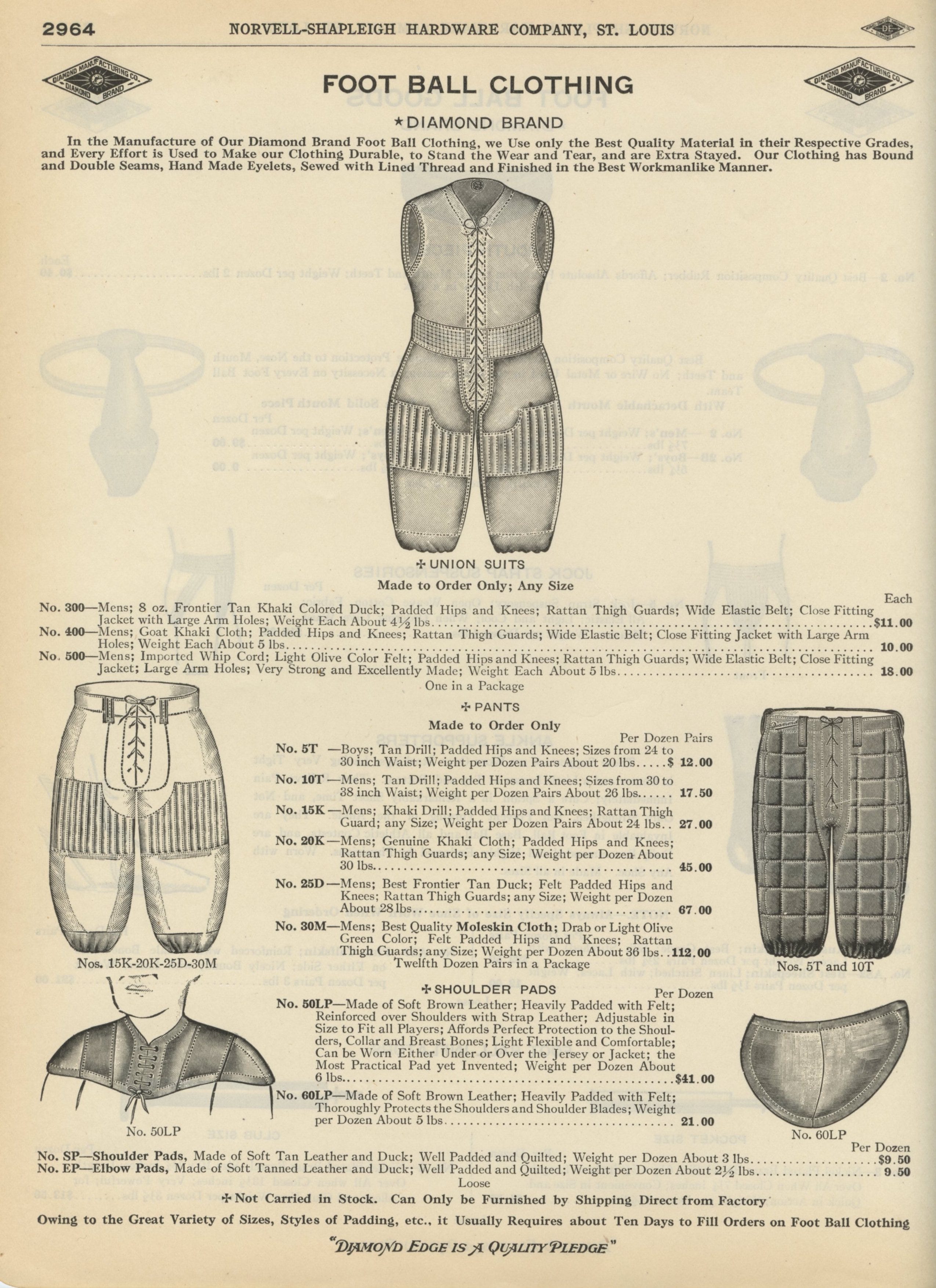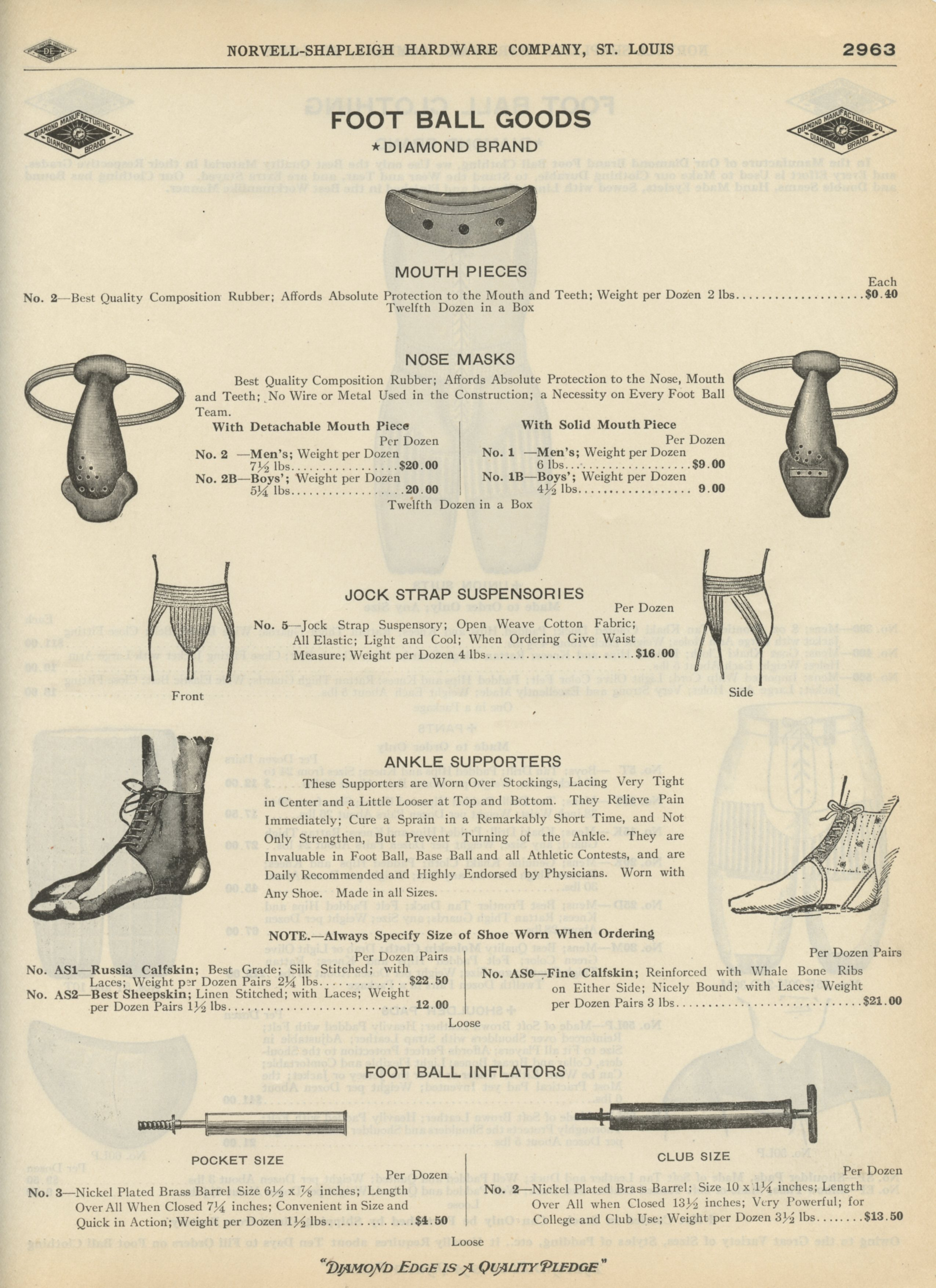Hardware stores once sold a broader range of goods than they do today, and many small-town teams were outfitted by the hardware man. Two pages from St. Louis’ Norvell-Shapleigh (c. 1905) show they offered union suits, pants, nose guards, jock strap suspensories, and foot ball inflators. Footballs, shoes, and other items would have been available on other pages.