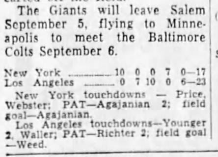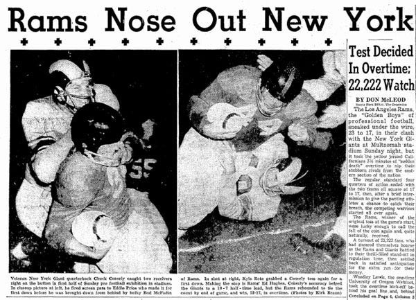 The New York Giants spent their 1955 training camp on the Willamette College campus in Salem, Oregon, and played a late August exhibition game against the Los Angeles Rams at Portland's Multnomah Stadium. The game was the brainchild of Harry Glickman, a local promoter interested in selling as many tickets as possible to the event. Rather than relying solely on the game to provide the draw, he petitioned and received permission from the NFL to employ two innovations during the game.