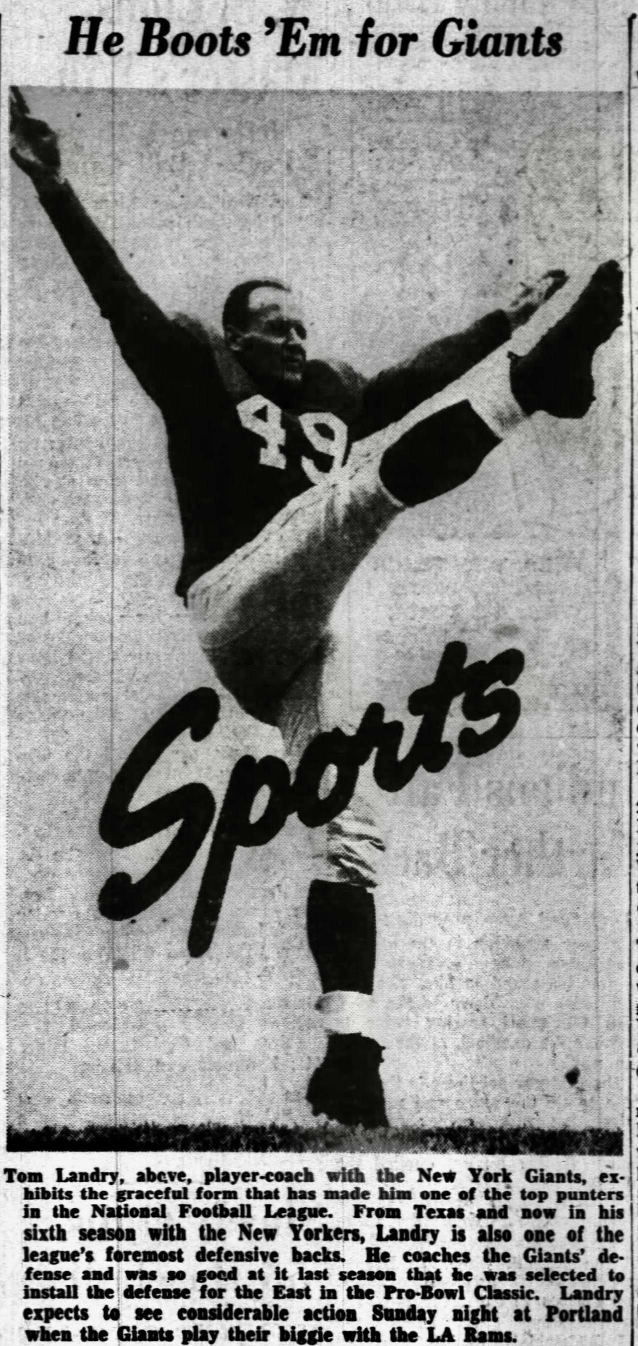 The newspaper also touted the stars that played for both teams, including the Giants' punter-defensive back-defensive coordinator Tom Landry.