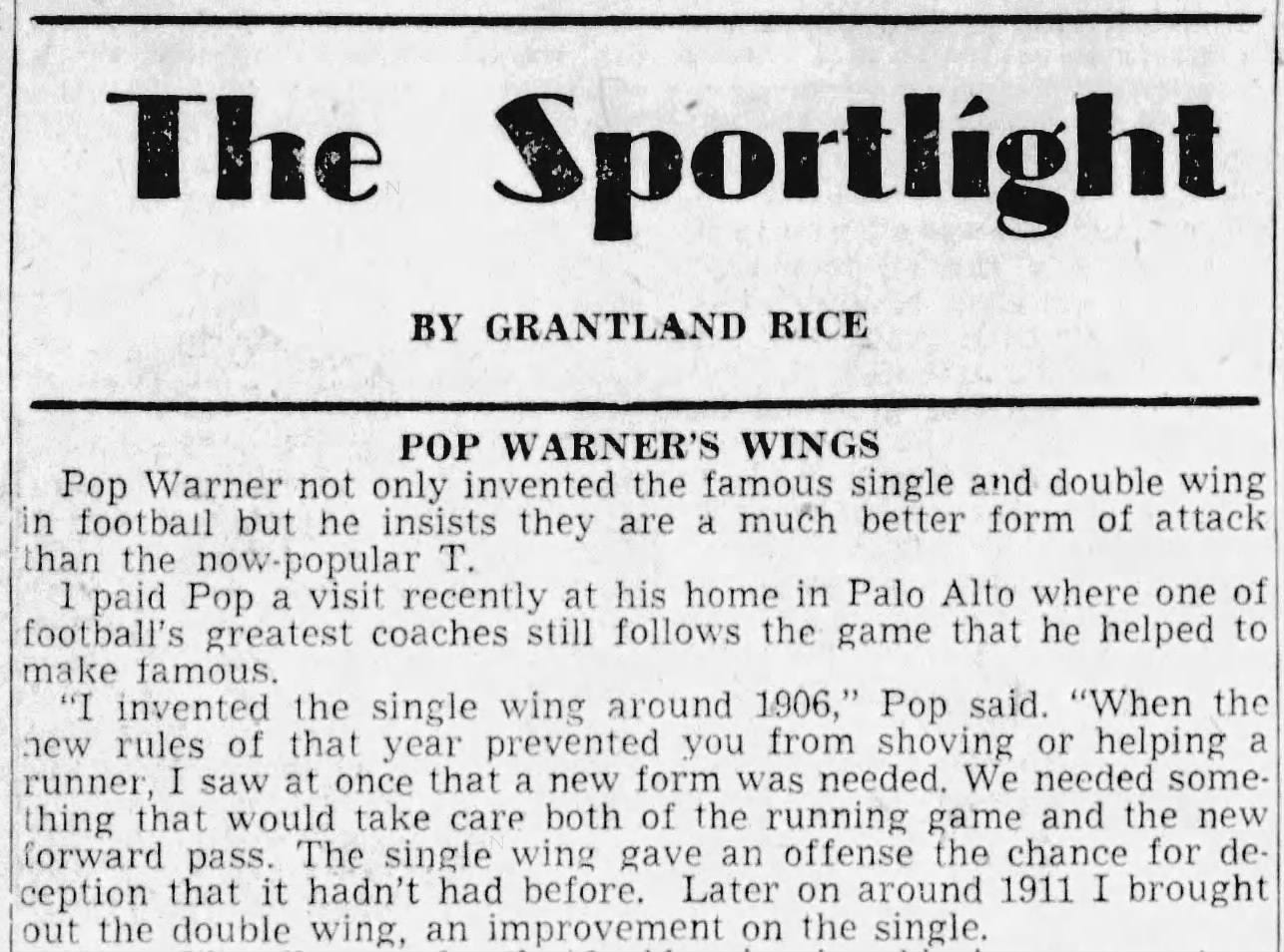 Grantland Rice spent an afternoon at Pop Warner's Palo Alto home in 1950, ten years after Warner ended his 45-year coaching career. Rice had first seen a Warner-coached team play as a 16-year-old in 1896 when Warner's Georgia Bulldogs visited Vanderbilt. The two had much to talk about as Warner recalled the origins of the Single and Double Wing, his skepticism about the Modern T as a passing offense, and his comparison of Jim Thorpe and Ernie Nevers.