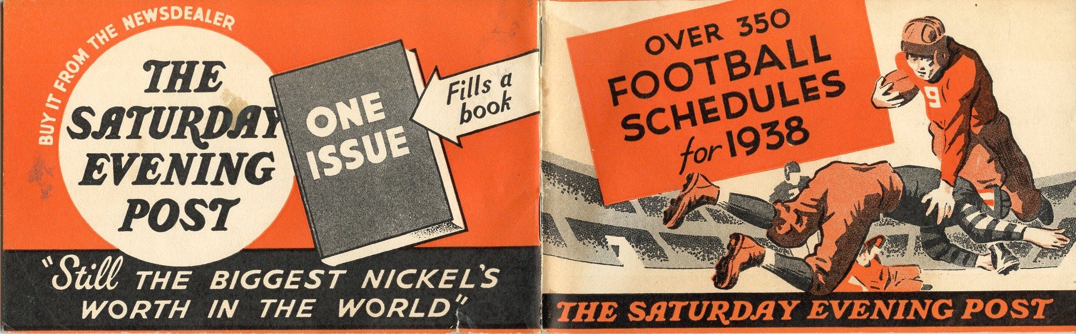 Last for now is the 1938 Saturday Evening Post cover. The player being tackled in the big stadium is fun, as is the opposite page slogan reminding all that the Saturday Evening Post was a bargain since it was “Still the biggest nickel’s worth it the world.”