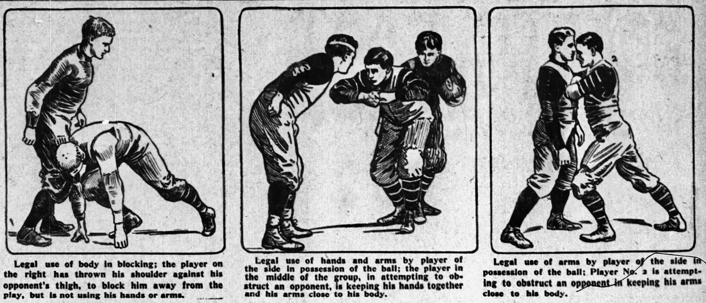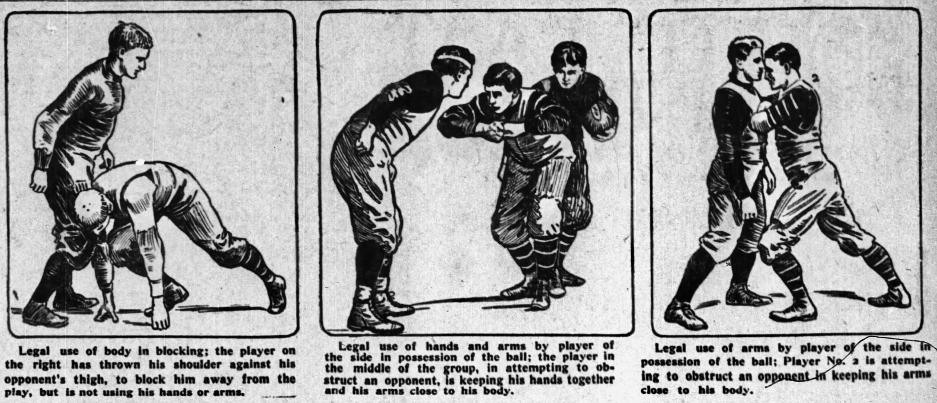 The story concerns why football prohibited offensive players from using their arms when blocking for many years. In its early days, football was rugby. Americans adopted England's Rugby Union Rules in 1876, other than a couple of minor tweaks. There were only 61 rules, and some of them were not terribly clear, so they interpreted them to the best of their ability. Even when they understood the rules, they did not always like them, so the American college players started changing them. After enough changes piled up, Americans were no longer playing rugby; it had become a different game.