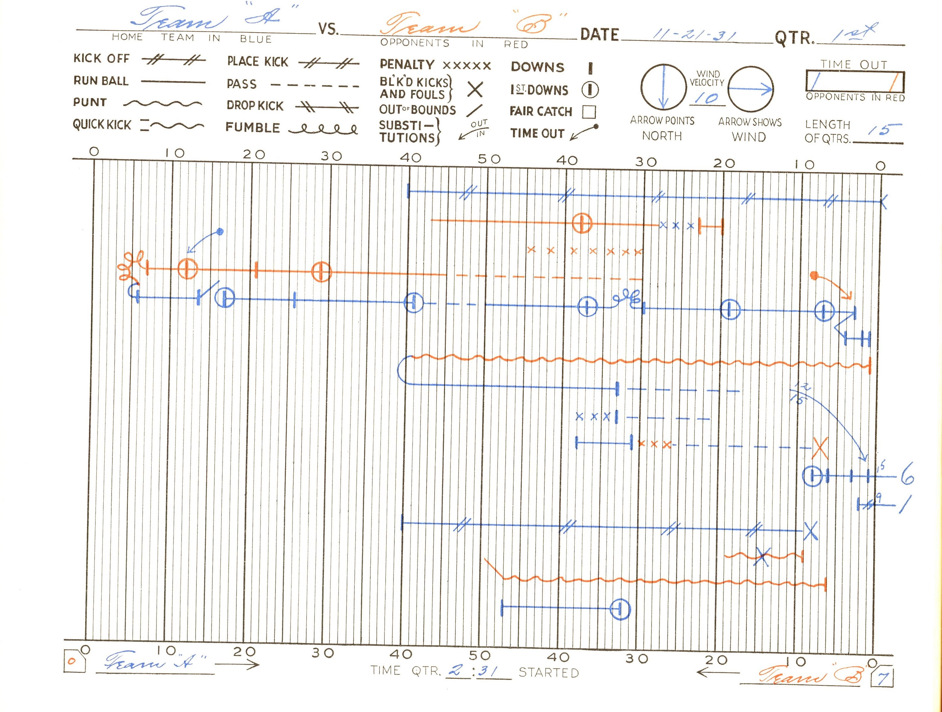 As they argued in the directions below, charting the plays helped the radio listener visualize the game's ebbs and flows. Tracking the scoring, number of completed and incomplete passes, and the like also added to fans' enjoyment of the game, particularly if fans used the suggested symbols to distinguish ball movements resulting from runs, passes, punts, or kicks.