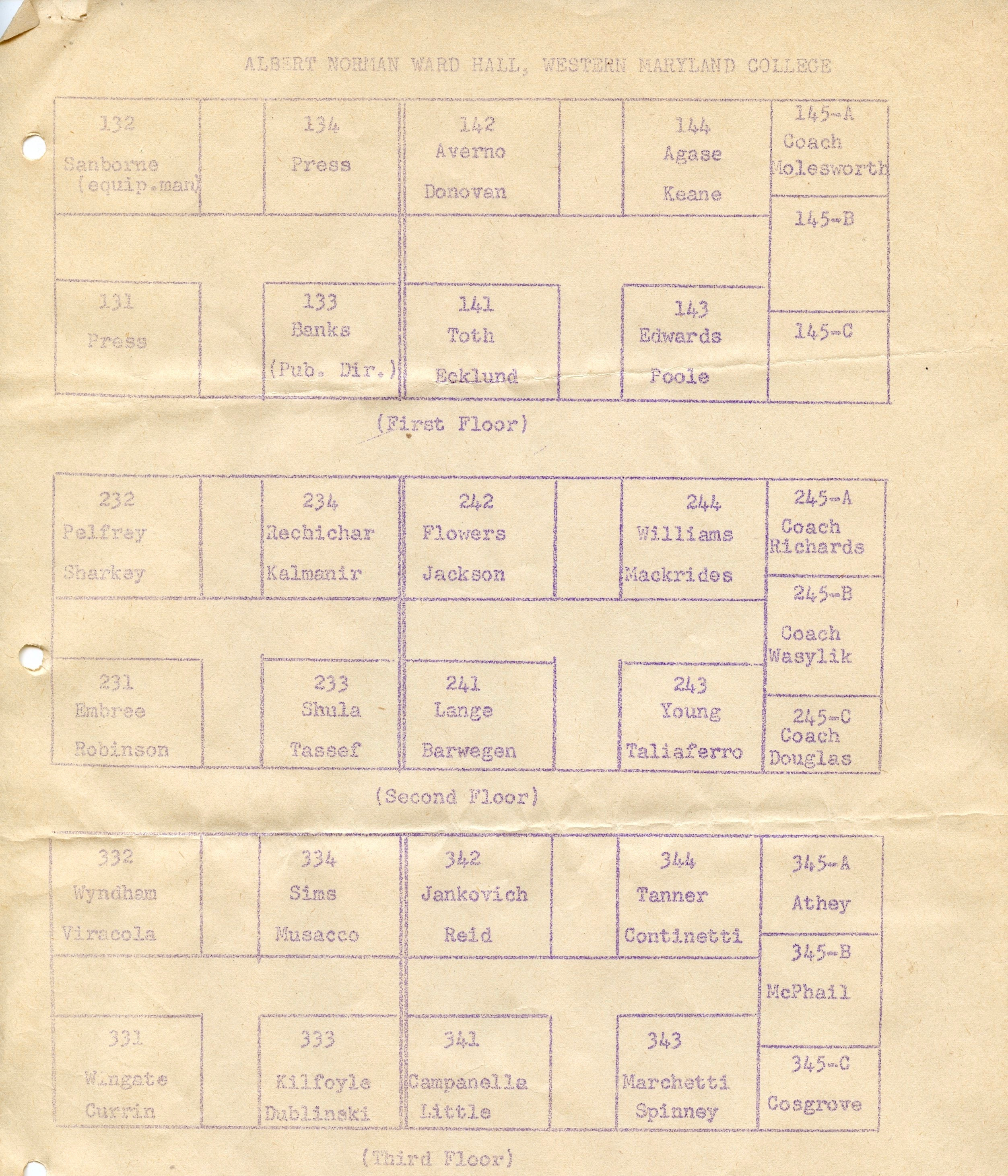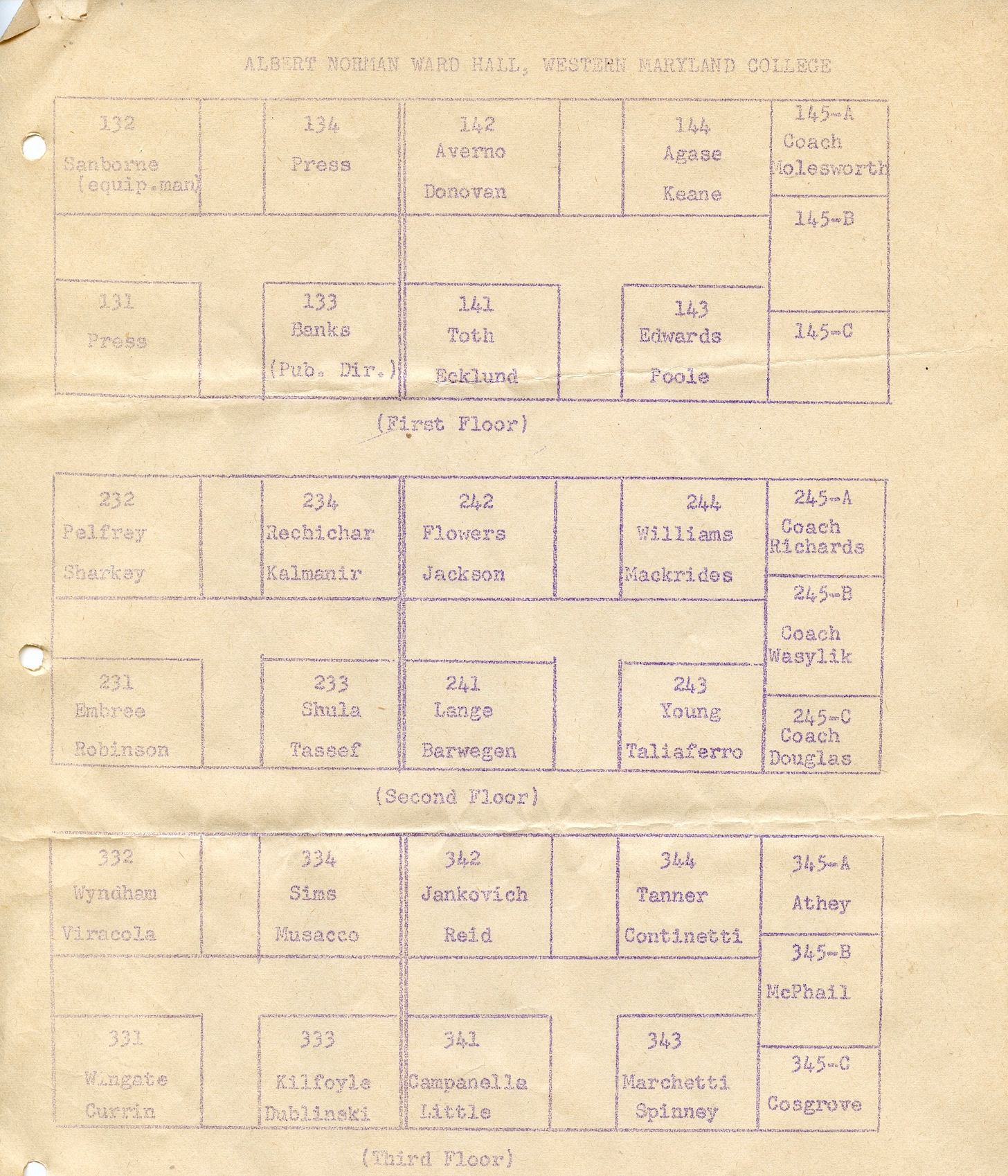 I recently acquired a small collection of mid-1950s NFL playbooks and other documents, including the 1953 Baltimore Colts Training Camp Guidelines that outline the rules and regulations during the team's stay in Albert Normal Ward Hall on the campus of Western Maryland, now McDaniel College. We'll focus today on this document, which includes basic instructions and room assignments for the players, coaches, and assorted others.