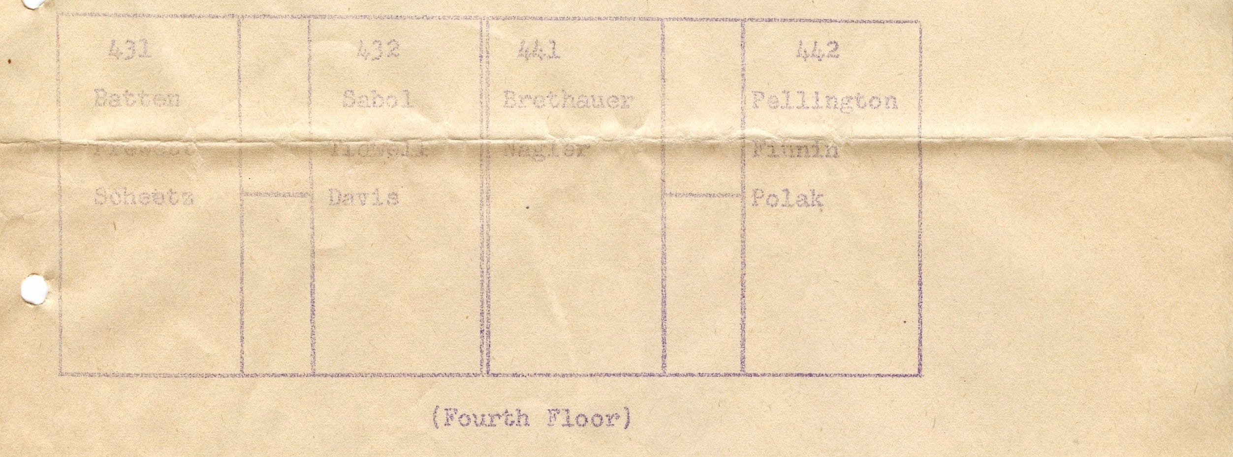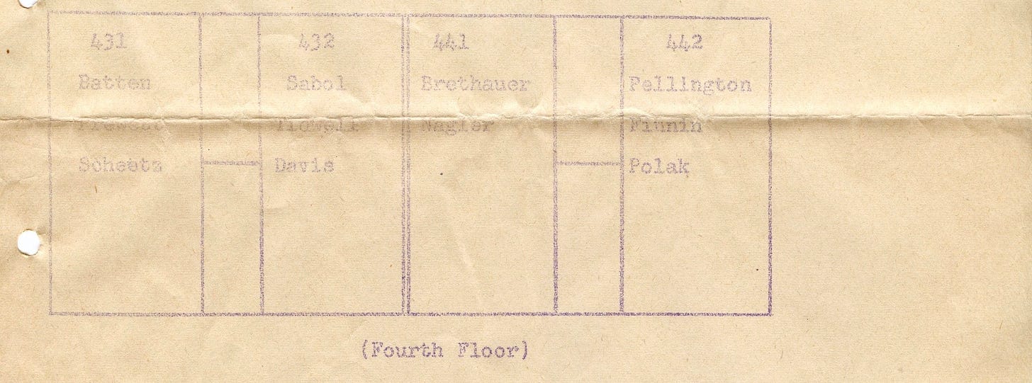 Page 4 lists the room assignments for players, coaches, and staff, while page 5 has drawings of each dormitory floor. Some players, particularly rookies, tripled up in larger rooms on the fourth floor. Most did not triple up for long. Names and room assignments worth noting include:
