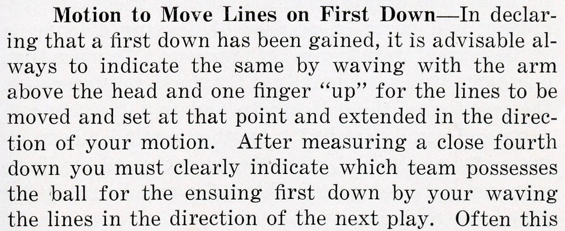 F. A. Lambert, who often worked Big Ten games, published Football Officiating and Interpretation of the Rules in 1926, which included a lengthy discussion of how to assess whether to bring the chains onto the field and the procedures for handling a close measurement. If the measurement confirmed the offense had gained a first down, he recommended the referee signal the first down by “waving with the arm above the head and one finger “up” for the lines to be moved.”
