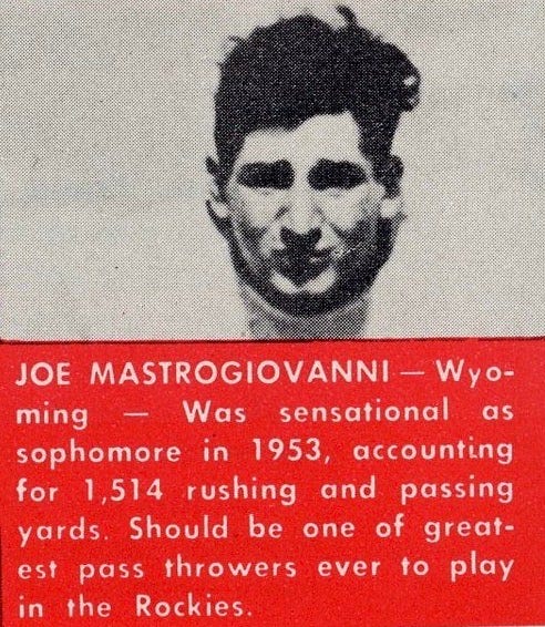Joe Mastrogiovanni, a Brooklynite, was a halfback that became Wyoming's first throwing quarterback when they converted to the T formation in 1952. He led the team in passing for three years, punted, and kicked three game-winning field goals in 1954. Joe was a two-time All-Skyline quarterback, earning second-team honors for the 1954 season. Drafted in the 17th round by the Eagles, Mastrogiovanni did not play in the NFL.