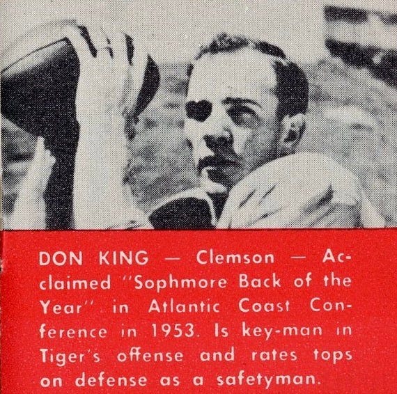 Don King set Clemson's game rushing record for freshmen versus Fordham in 1951 by gaining 234 yards as a Single-Wing tailback. He became a T-formation quarterback his sophomore season when college football returned to the single platoon game. In addition to leading the team in passing four straight years, he was named second-team All-ACC in 1953 and 1954. However, perhaps the top collegiate achievement for the undrafted King was winning the Boston Globe's "Swede" Nelson Sportsmanship Award in 1953. He earned the award by instructing his team to avoid tackling the Wake Forest quarterback low after the QB injured his knee early in their game.
