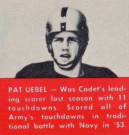 Vince Lombardi, then an Army assistant, recruited Pat Eubel to West Point, where he had two rushing TDs and a 70-yard punt return for a touchdown in the 1953 Army-Navy game. The 1954 team led the nation in total offense, finishing 7-2 and ranked #7. He captained the 1955 team to a 6-3 record and went in the 14th round to the Washington Redskins, but his Army duties prevented him from pursuing pro football.
