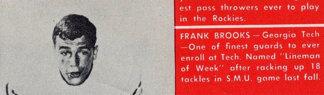 Frank Brooks of Georgia Tech caught the nation's attention by making 18 tackles versus SMU in 1953. He helped lead Georgia Tech to the Sugar Bowl as a sophomore and the Cotton Bowl as a junior before being named the Sugar Bowl MVP as a senior. Tech’s team voted to play Pitt in that Sugar Bowl, allowing Bob Grier to become the first Black player in a bowl game in the Deep South. Brooks went in the 25th round of the NFL draft but became an assistant at Georgia Tech instead. Brooks died at 42 from mesothelioma after handling asbestos at a factory during high school summers.