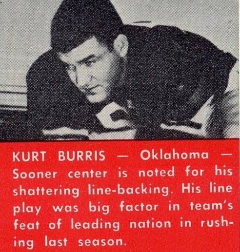 Kurt Burris played center and linebacker as one of five brothers to play for Oklahoma under Bud Wilkinson. A team leader when the Sooners finished ranked #3 in 1954, Wilkinson and the Oklahoma SID promoted him for the Heisman, mailing 3,500 letters to sports editors nationwide. Perhaps it worked as he finished second in the voting. Drafted in the first round by the Cleveland Browns, Burris chose to play in Canada, where he won the Grey Cup his first two seasons in Edmonton. He played three more years in Canada and is enshrined in the College Football Hall of Fame.