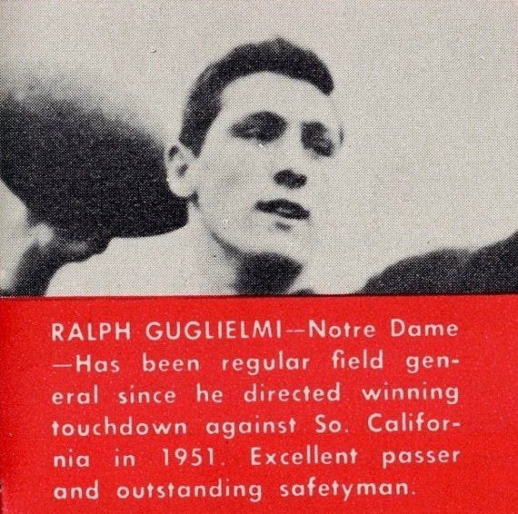 Ralph Guglielmi quarterbacked Notre Dame to a #2 ranking in 1953 as teammate John Lattner won the Heisman. As a senior in 1954, he was a consensus All-American and finished fourth in the Heisman voting after leading Notre Dame to a #4 rating and a 9-1 season. The Redskins took Guglielmi with the fourth pick in the 1955 NFL Draft, after which he played with four teams over eight seasons. (He missed two seasons while in the Air Force following his rookie season.) He is a member of the College Football Hall of Fame.
