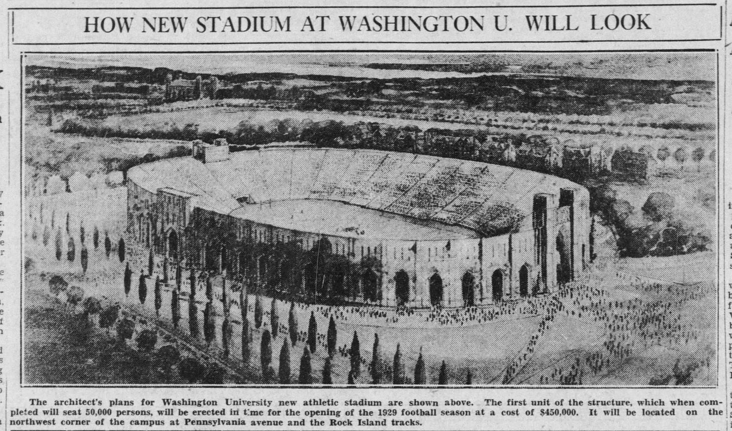 So, WashU announced plans for a 50,000 on-campus stadium along with plans to raise the money for the stadium in November 1928. Of course, the stadium was never built, WashU eventually dropped out of the Missouri Valley and plays DIII football today.