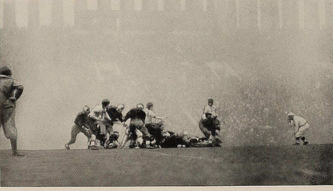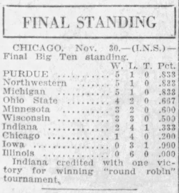While those six teams played regulation, 60-minute games, the Saturday after Thanksgiving, the other four teams played on Thanksgiving Day at Chicago's Stagg Field. Rather than play regulation games, the cellar dwellers played a tournament with 30-minute games. The morning matchups saw Chicago beat Iowa 7-0 while Indiana tied Illinois in a scoreless game. However, Indiana had more first downs than Illinois, so they advanced to face Chicago in the afternoon game, winning 7-0. (If you think playing two shortened games in a day is unusual, Chicago, Michigan, Purdue, and Wisconsin played full doubleheaders to open the 1931 season, which you can read about here.)