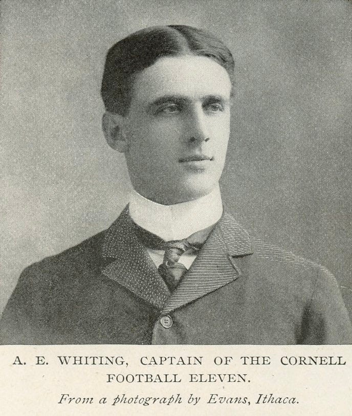 Coached by Pop Warner and captained by Allen Whiting, Cornell went 10-2 with losses to Princeton and Penn. They did not play Harvard or Yale. As described in a recent Tidbit, Whiting was the third player to execute the hidden ball trick when he did so in 1897, two years after John Heisman’s Auburn’s team pulled off the trick twice, the second time when playing Pop Warner’s Georgia team.