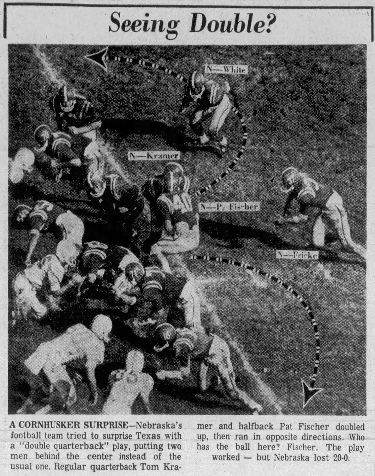 The next time the formation had defenses seeing double was in 1959, when Nebraska opened its season at home against Texas, en route to a 4-6 season that fell short of the Lincolnites’ expectations. Anyway, they pulled the combo-QB a few times as Texas coach Darrell Royal screamed to the officials that the formation was illegal. Royal knew it was illegal after investigating and opted against it due to its illegality. Of course, Nebraska coach Bill Jennings also knew it was illegal, but he figured he would force the officials to call it and penalize the Cornhuskers, which they did not do that game. It didn’t work that well, so they returned to their standard formations, which also didn’t work.