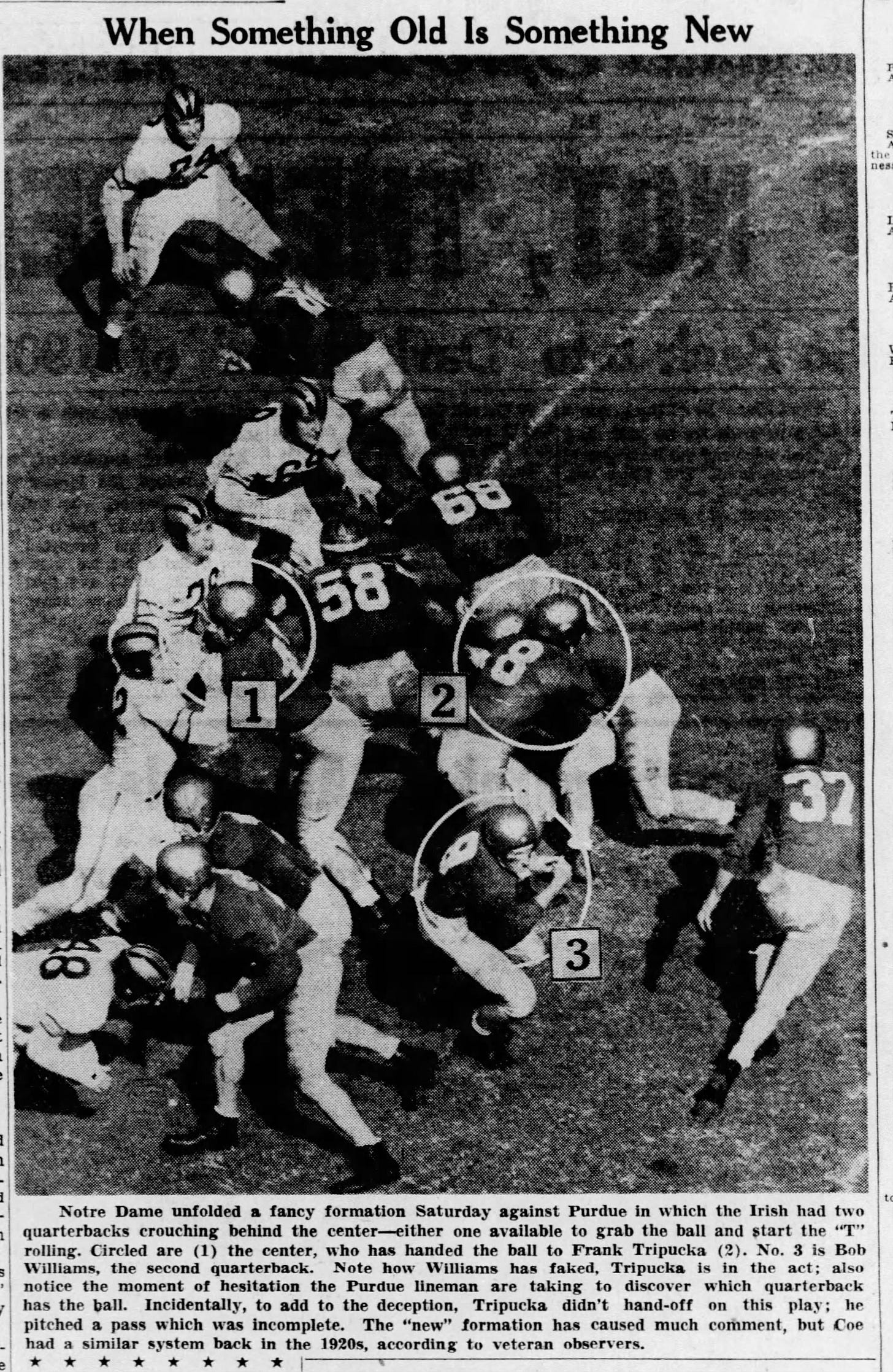 Notre Dame beat Purdue 28-27, aided by two interception returns for touchdowns, but the game was most notable for something else that came in twos: Notre Dame’s quarterbacks. Partway through the third quarter, Leahy sent backup quarterback Bob Williams into the game. Rather than replace Tripucka, fullback Panelli left the field, and when the Irish broke the huddle, both Tripucka and Williams lined up at quarter center, side-by-side, with their hands under center.