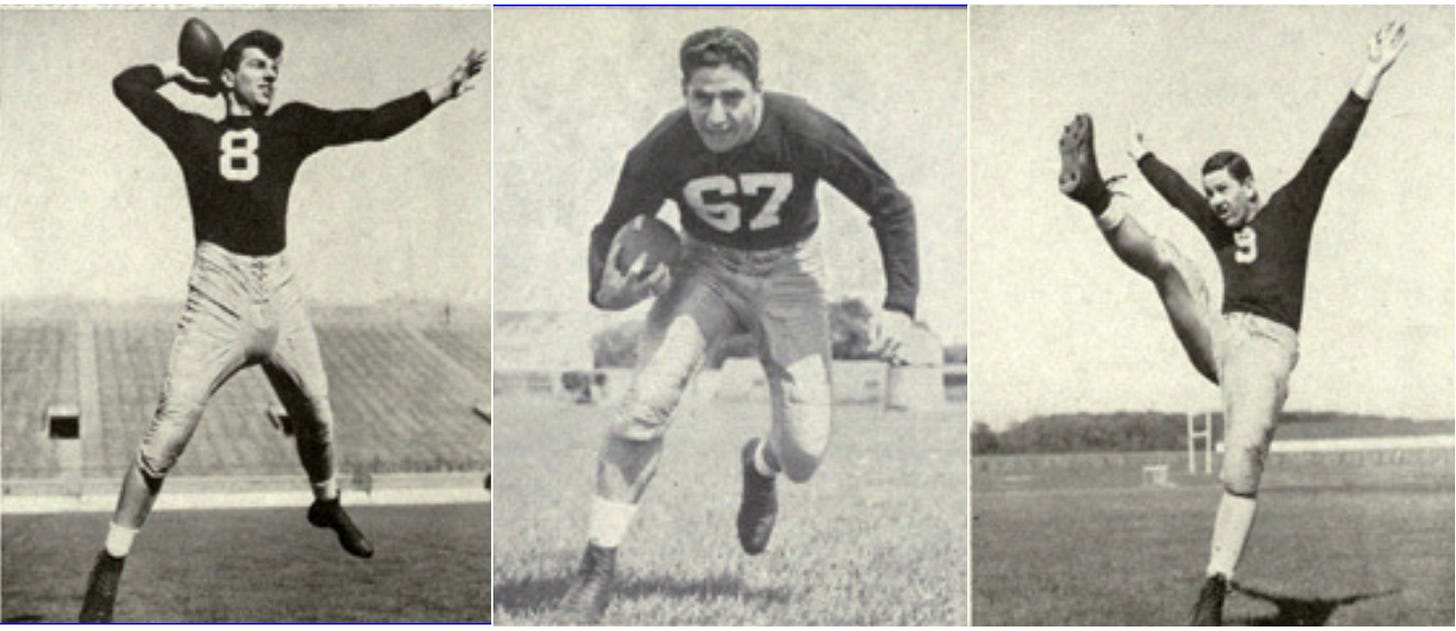 Coming off two seasons with Johnny Lujack as the starter, including his 1947 Heisman campaign, senior, but relatively untested, Frank Tripucka took over as the Irish starter as their T-formation quarterback. Tripucka would become an NFL first-round draft choice and play four years in the NFL, seven in the CFL, and four in the AFL, but his career prospects were uncertain in September 1948. He also fathered a host of fine athletes, but that’s another story.