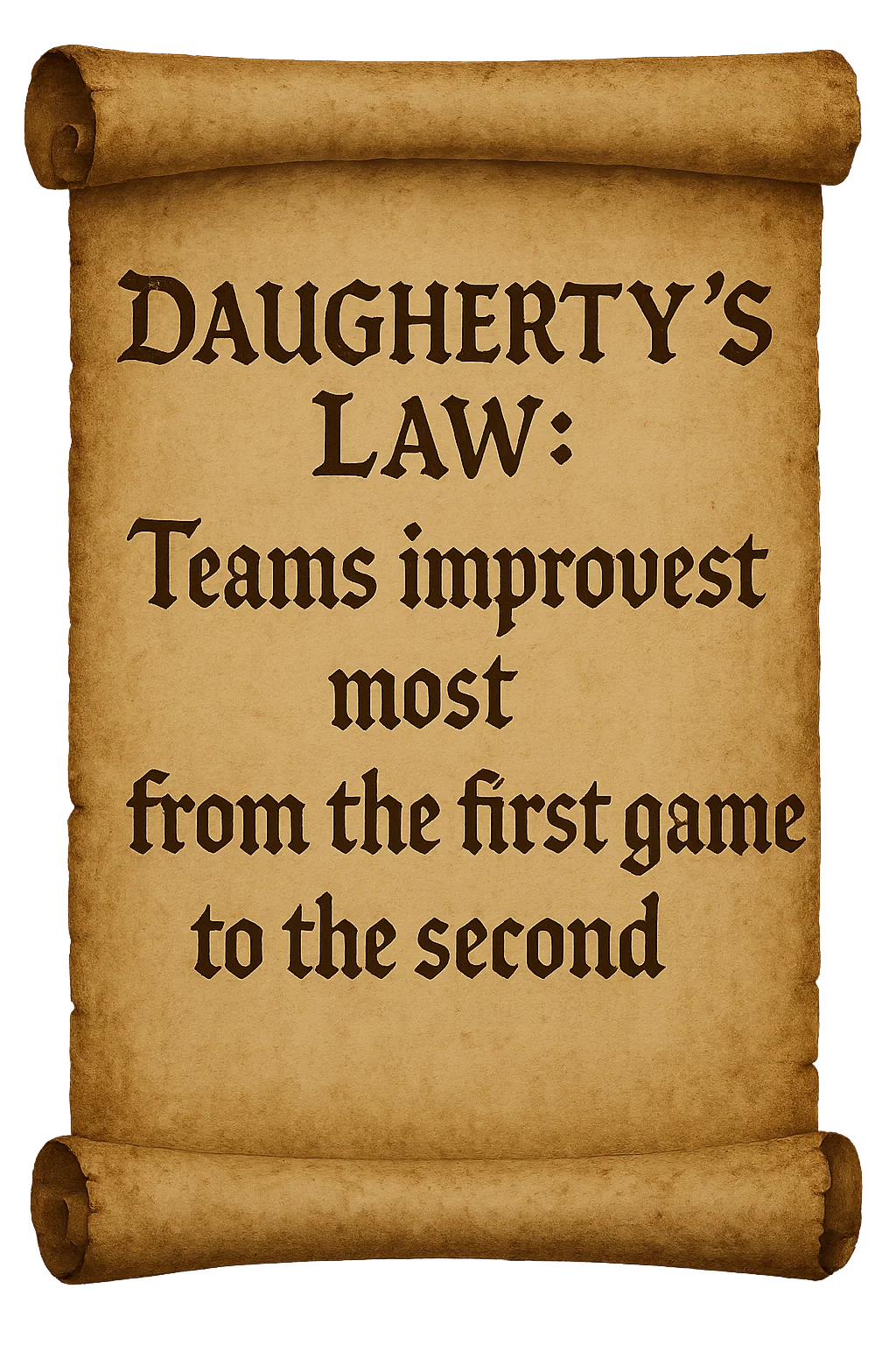 Daugherty's Law has floated around practice fields and coaches' offices ever since. The Law gets raised most often when a team that has yet to play meets another that has played one or two games. The application of Daugherty's Law peaked between 1985 and 1995 when the start of the football season crept earlier and earlier as early-season made-for-TV games for select teams became a thing.