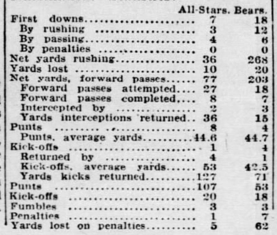 The Bob Zuppke-led All-Stars’ best chance at scoring came when Notre Dame’s Steve Juzwik returned a punt 84 yards to the Bears’ 6-yard line, but the collegians failed to move the ball on four downs and went scoreless for the game.