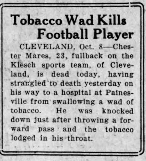 As I recall from my high school days, athletes were forbidden from using alcohol or tobacco and risked losing their eligibility if found out. Unfortunately for Chester Mares, who played semi-pro football for Klesch Sports of Cleveland, tobacco use was not just a long-term health risk. Playing fullback in a game in Willoughby, Ohio, Mares threw a pass and was immediately tackled to the ground. At that point, the plug or wad of tobacco he was chewing while playing became lodged in his throat. The Heimlich maneuver arrived in 1974, forty-one years after Mares needed it, with the result that Mares died of strangulation on the field.