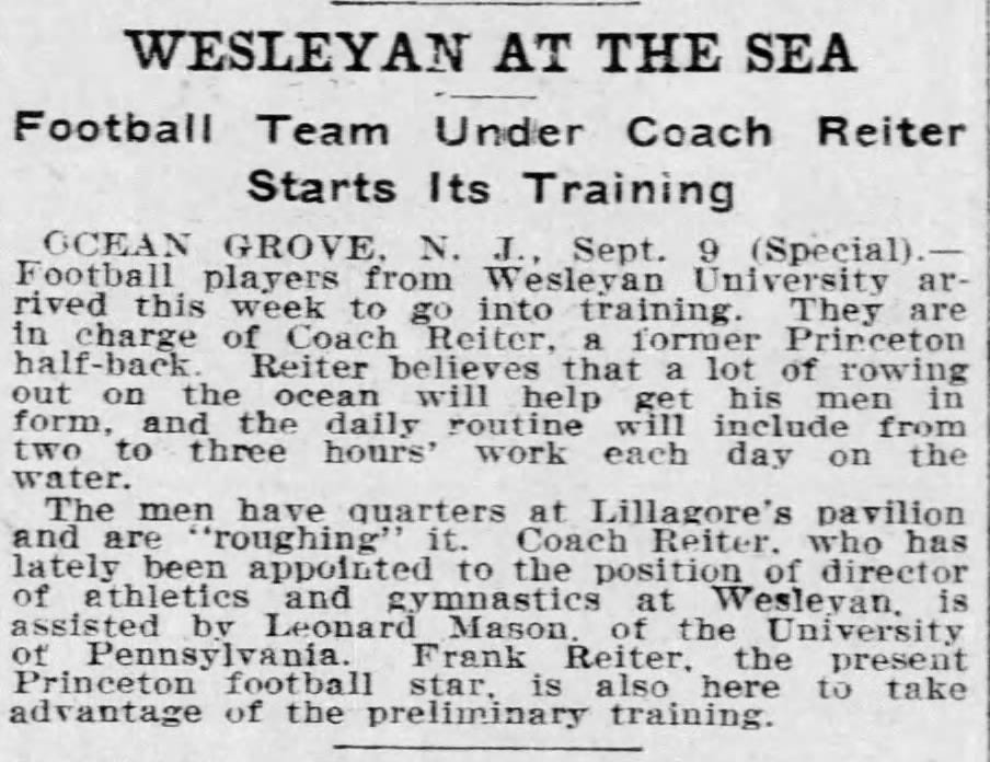 In 1903, he took over as director of physical conditioning at Wesleyan, and his teams went 3-6-1 and 3-7 in his first two years while playing some of the East's top teams. Reiter, an all-around athlete, decided his 1905 team would be in peak physical condition, so their preseason conditioning heavily relied on ocean rowing.