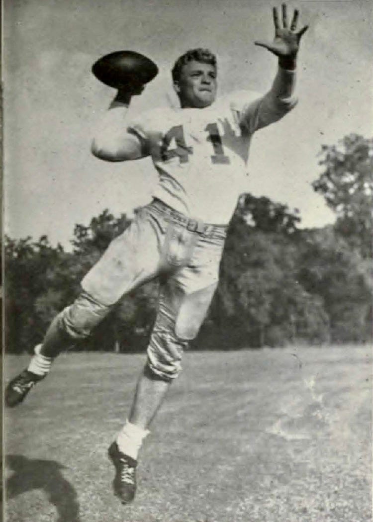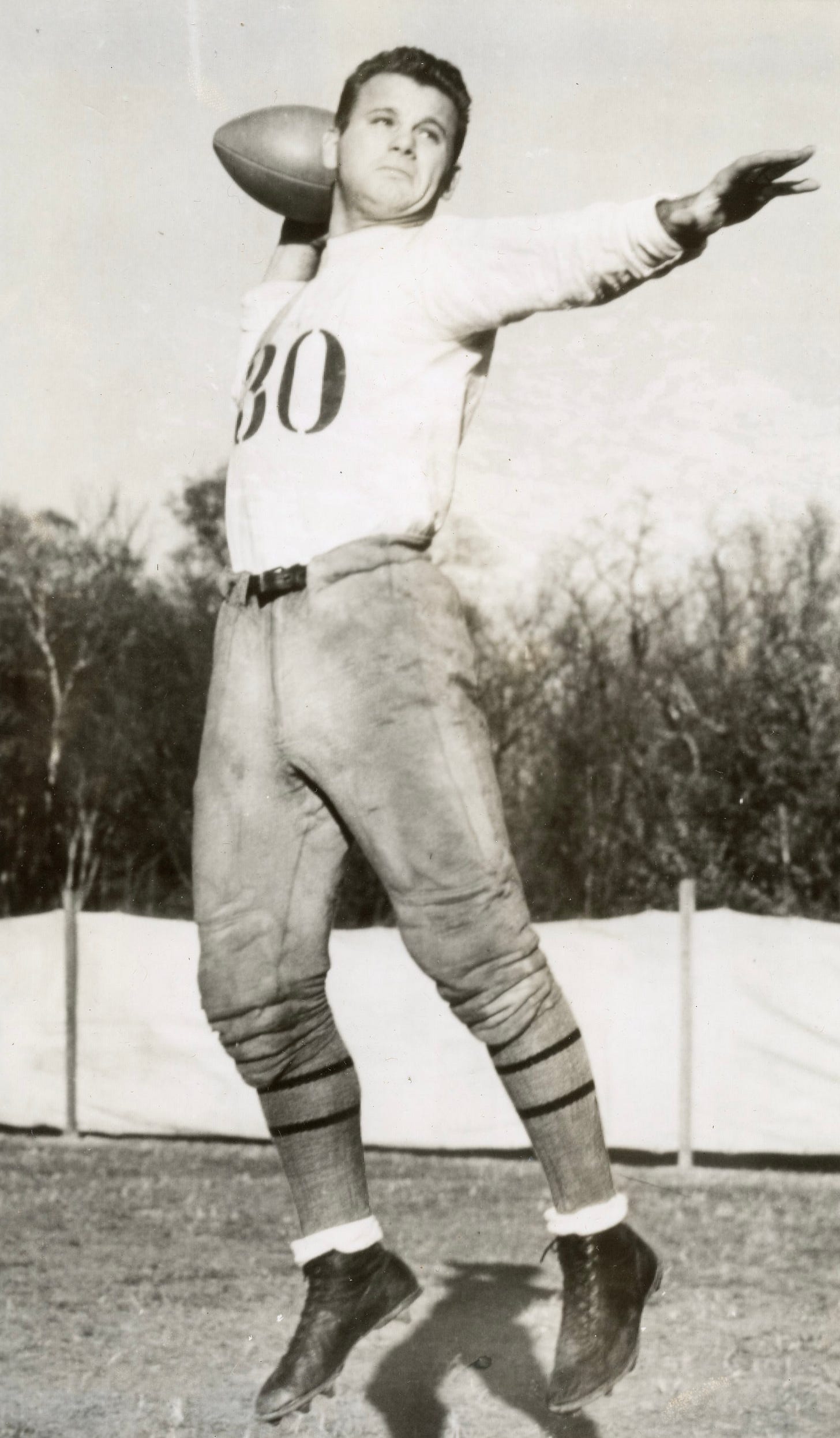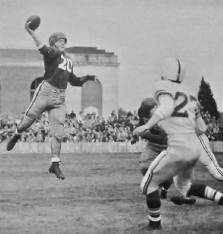 The photo is from 1938, seven years before the NCAA lifted the restriction on throwing within five yards of the line of scrimmage, so he threw jump passes while rolling out or from what later became the pocket.