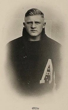 The academies did not follow the four-year eligibility rules back then, so Oliphant participated in the same sports on the Hudson, earning 11 letters, and becoming the first cadet to letter in all four major sports. He was a two-time All-American running back there. He was so impressive that he was selected in 1958 by the Football Writers Association of America as one of the eleven top players for football’s first 50 years, joining backs Willie Heston (Michigan), Walter Eckersall (Chicago), and Jim Thorpe (Carlisle). Besides scoring 135 points at Purdue and 289 points at West Point, he led the NFL in scoring in 1921.