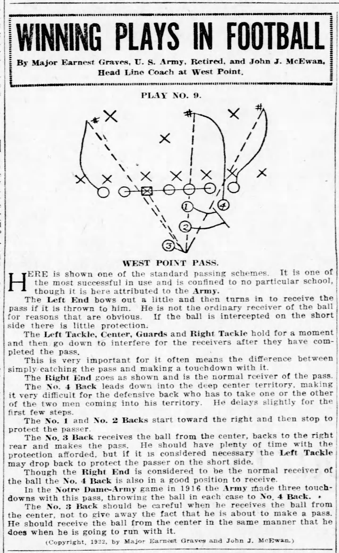 The play is among the first I’ve found that sent three receivers against a two-deep defensive backfield and had the passer read the defenders’ reactions to determine where to throw the ball. It’s simple stuff today, but the detailed description notes that Army scored three touchdowns on this play versus Notre Dame in 1916, when the forward pass was not yet a teenager.