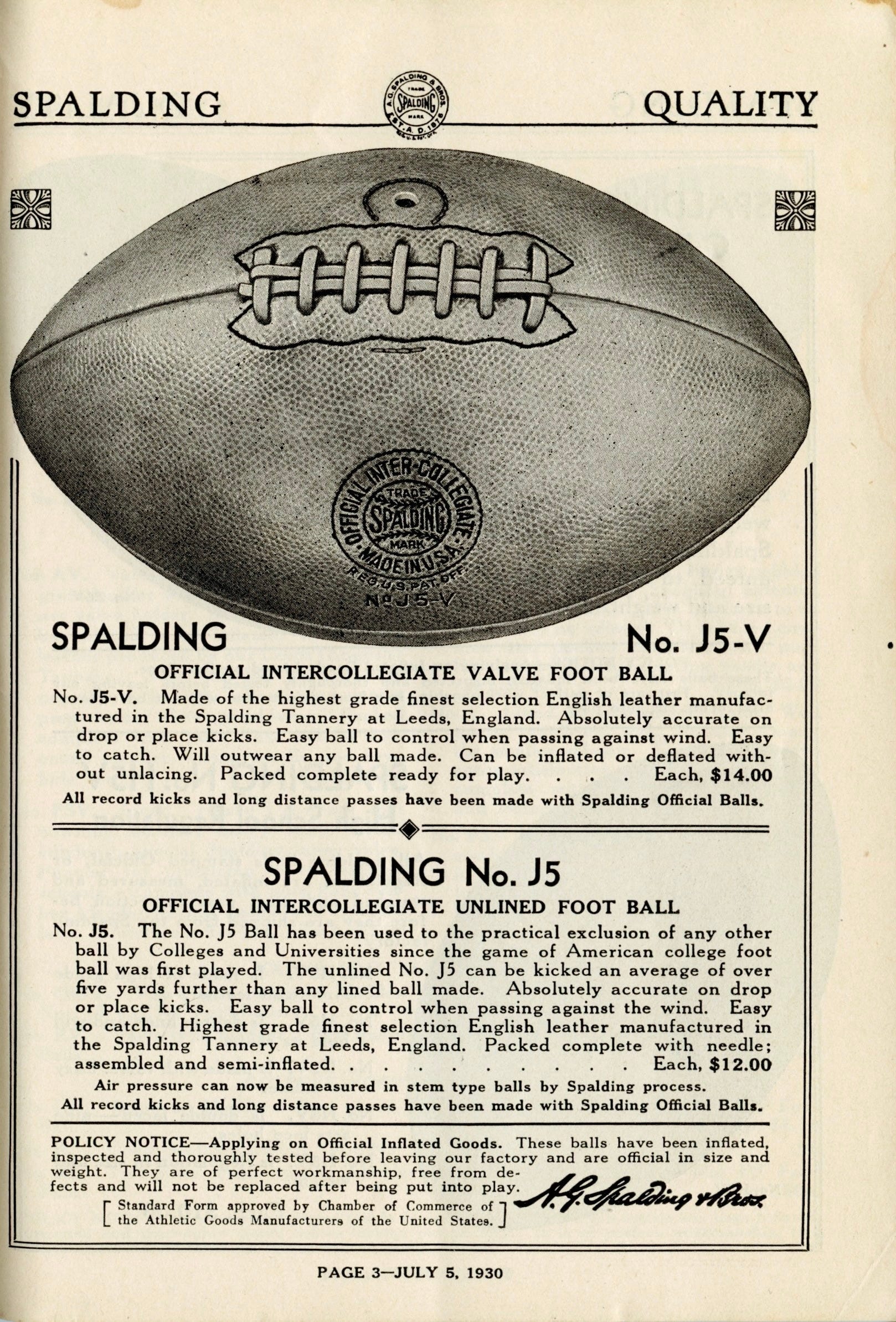 Of course, everyone alive today who trod the gridiron played with the J5-V, not the J5, so how did the V designator arrive on the scene? While the J originated as a Lillywhite model designator and the 5 indicated the ball’s size, Spalding added the V in 1926, which meant the ball had an internal valve. Until the mid-1920s, balls were inflated using a nozzle inserted directly into the bladder stem housed inside the leather cover. That meant the ball had to be unlaced and relaced whenever it needed more pressure. Likewise, the game lacked a method to inflate the ball to a particular level of pressure consistently. The internal valve changed that, and when the NCAA reduced the ball’s size in 1929, they also set the game’s first inflation standard, which effectively forced teams to use valved balls.