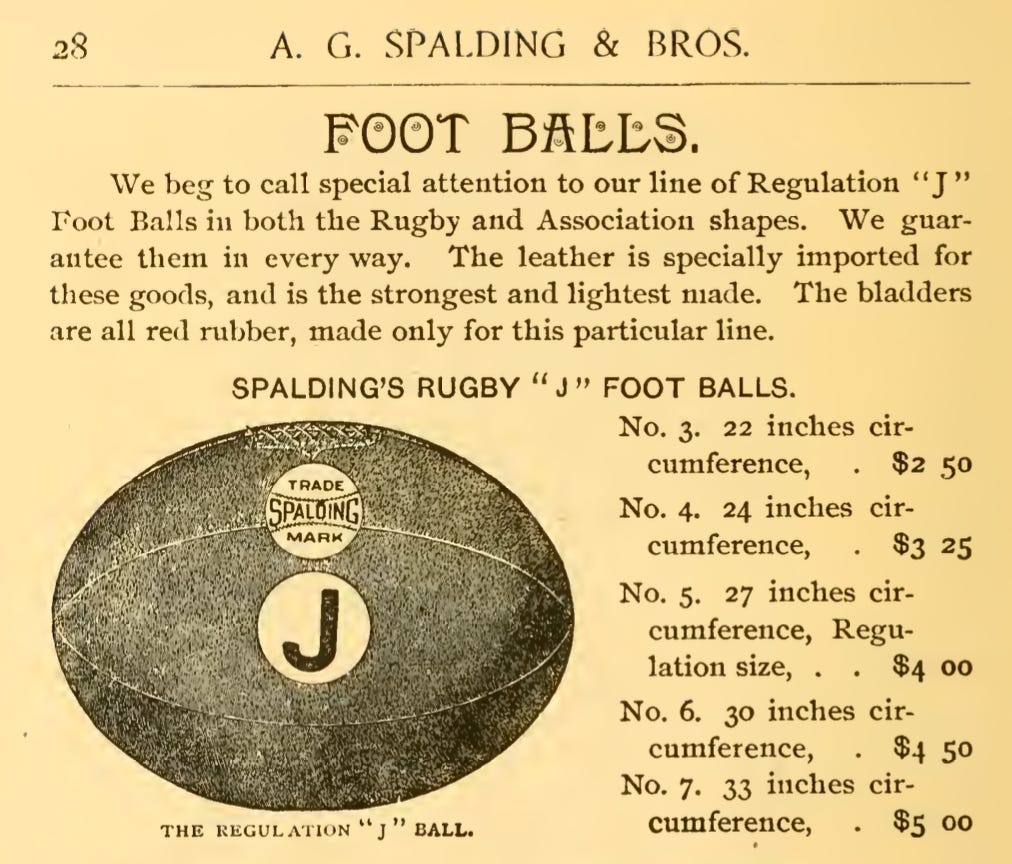 By 1886, A. G. Spalding sold Lillywhite rugby balls, a top English ball cobranded with a Spalding logo. They smartly convinced the Intercollegiate Football Association to designate the Lillywhite Model J5 (27-inch ball) the official ball by 1890. In 1892, however, Spalding got the Association to switch to a Spalding-made ball that also carried the Model J designation. While the designation officially applied only to the handful of schools in the Association, everyone in the country played by the IFA rules, so the “official” ball status helped sales in all 44 states.