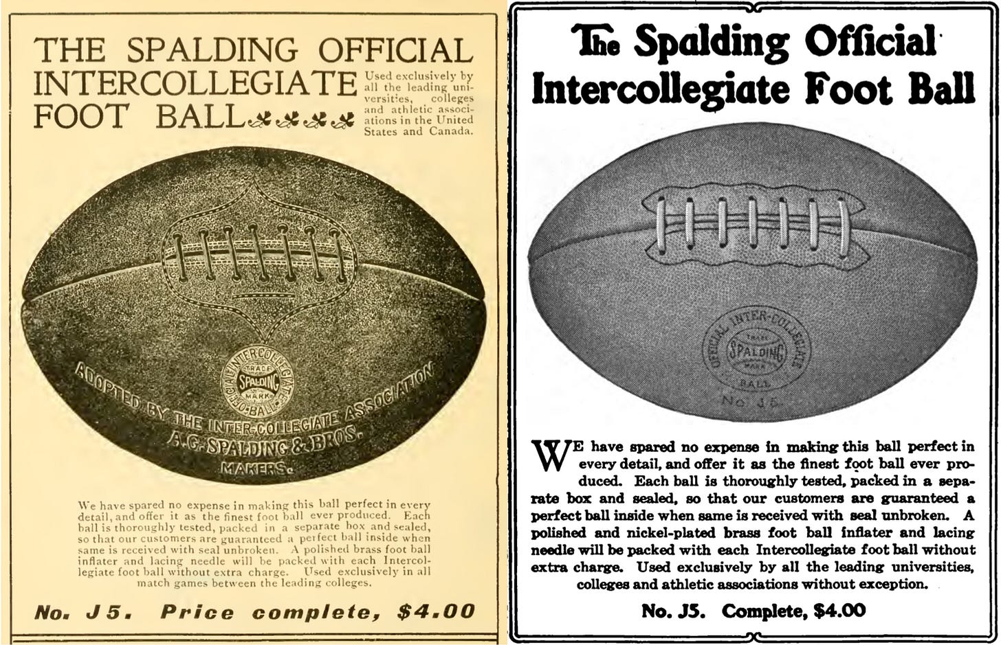 Still, the 27-inch ball was quite sizable and difficult to tote, so Spalding reduced the size of its footballs in 1903. However, it retained the J5 designation for its best ball, meaning the traditional numbering system no longer applied.