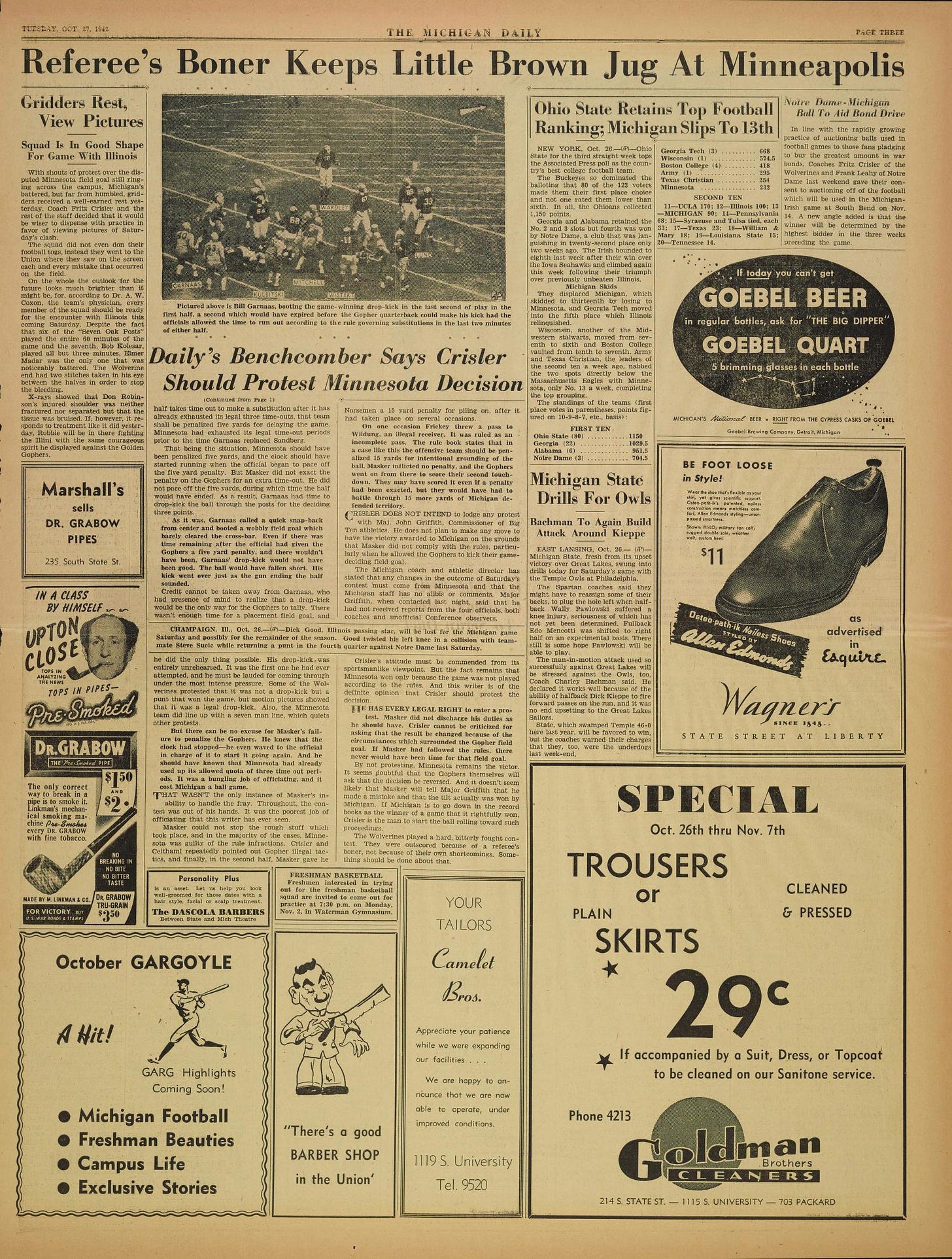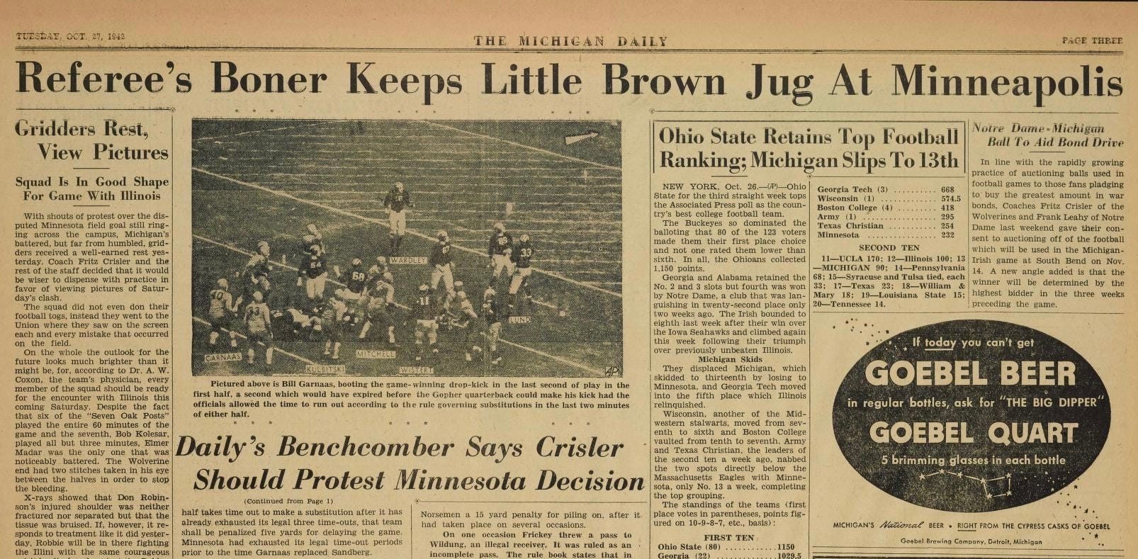The 1942 game resulted in Minnesota's ninth straight win over the Wolverines. However, the boys in blue still claim the loss resulted from a referee error, leading Michigan's student newspaper, The Michigan Daily, to summarize the result with the following headline.