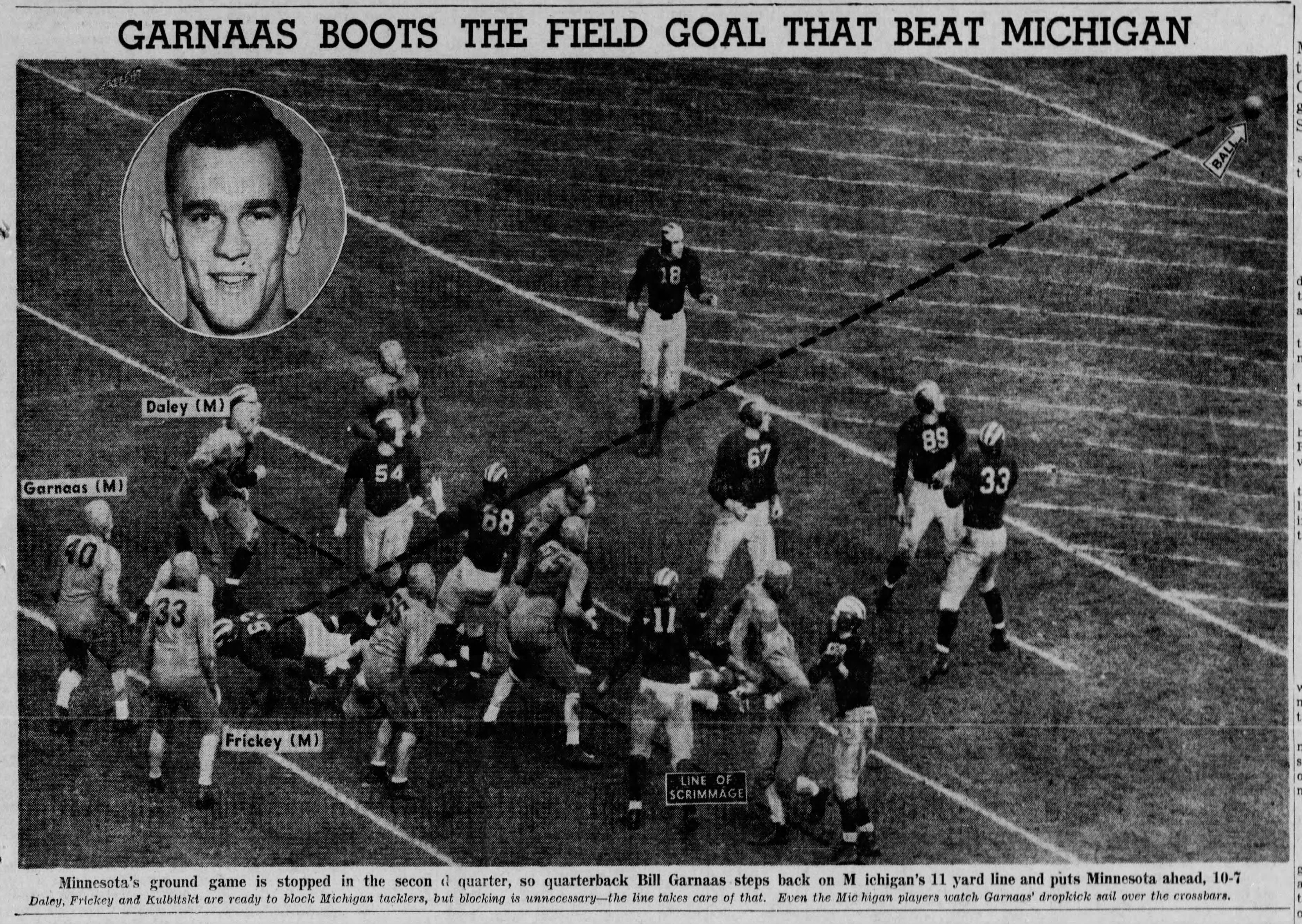 Minnesota then called two running plays that put the ball on the six. With the clock running down, Garnaas recognized the Gophers did not have time to set up for a placekicked field goal attempt, so he had the team quickly line up. With one second left, the center snapped to Garnaas standing deep, and he dropkicked the ball for a field goal.