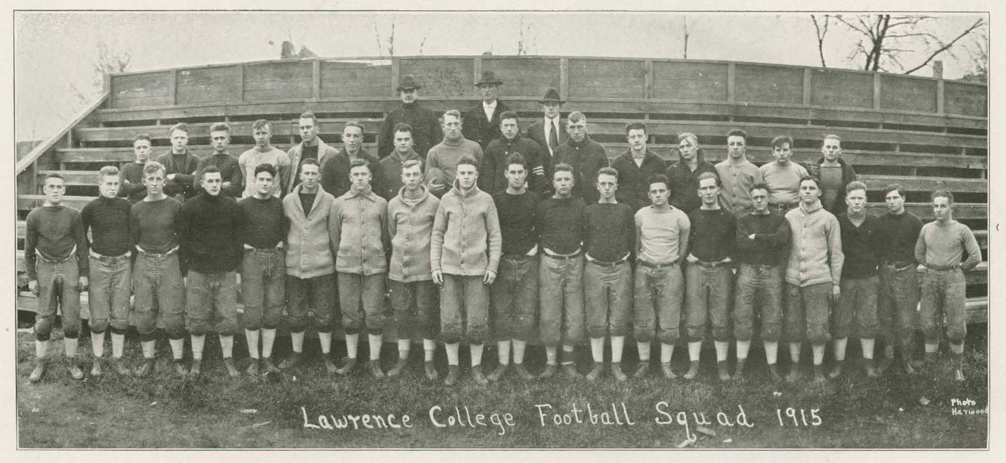 Lawrence had claimed Wisconsin’s unofficial small-college football championship four years straight, and while they often stepped up to play Wisconsin, the 1915 team faced Wisconsin and Michigan in back-to-back games four days apart.