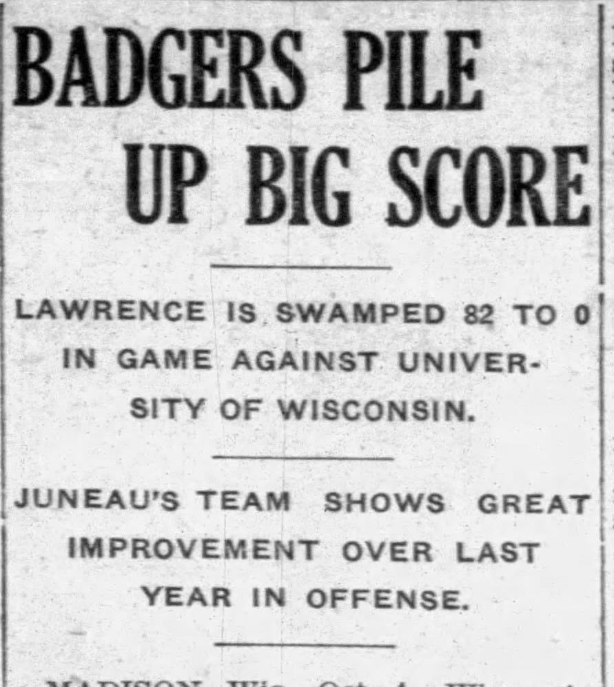 On the field, the Badgers whipped the Lawrence Vikings 82-0 by consistently throwing the ball forward and blocking Lawrence punts backward.