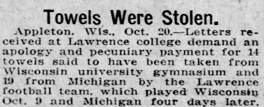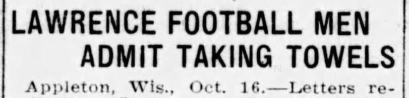 The two Western Conference schools likely had their school names painted on the towels, which the Lawrence players saw as mementos of their blowout losses; plain white towels would have held little sentimental value. Whatever the condition of the towels, a number went missing, and the following week, Lawrence received letters from both schools informing them of the missing towels, demanding an apology, and asking them to pay up.