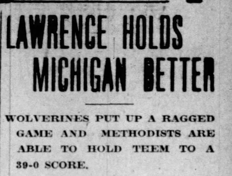 Following their dismal showing at Camp Randall, Lawrence traveled to Ann Arbor to take on Michigan at Ferry Field on a Wednesday afternoon. Despite the teams playing 10-minute quarters and Lawrence being allowed to substitute freely against their superior opponent, Michigan’s fans were disappointed in the Wolverines 39-0 win.