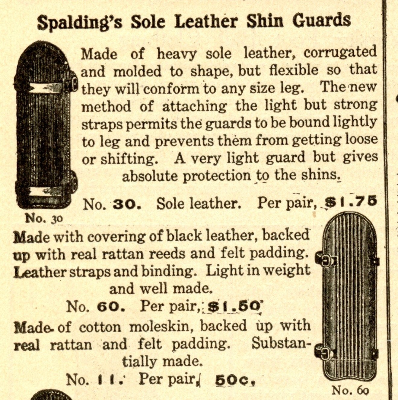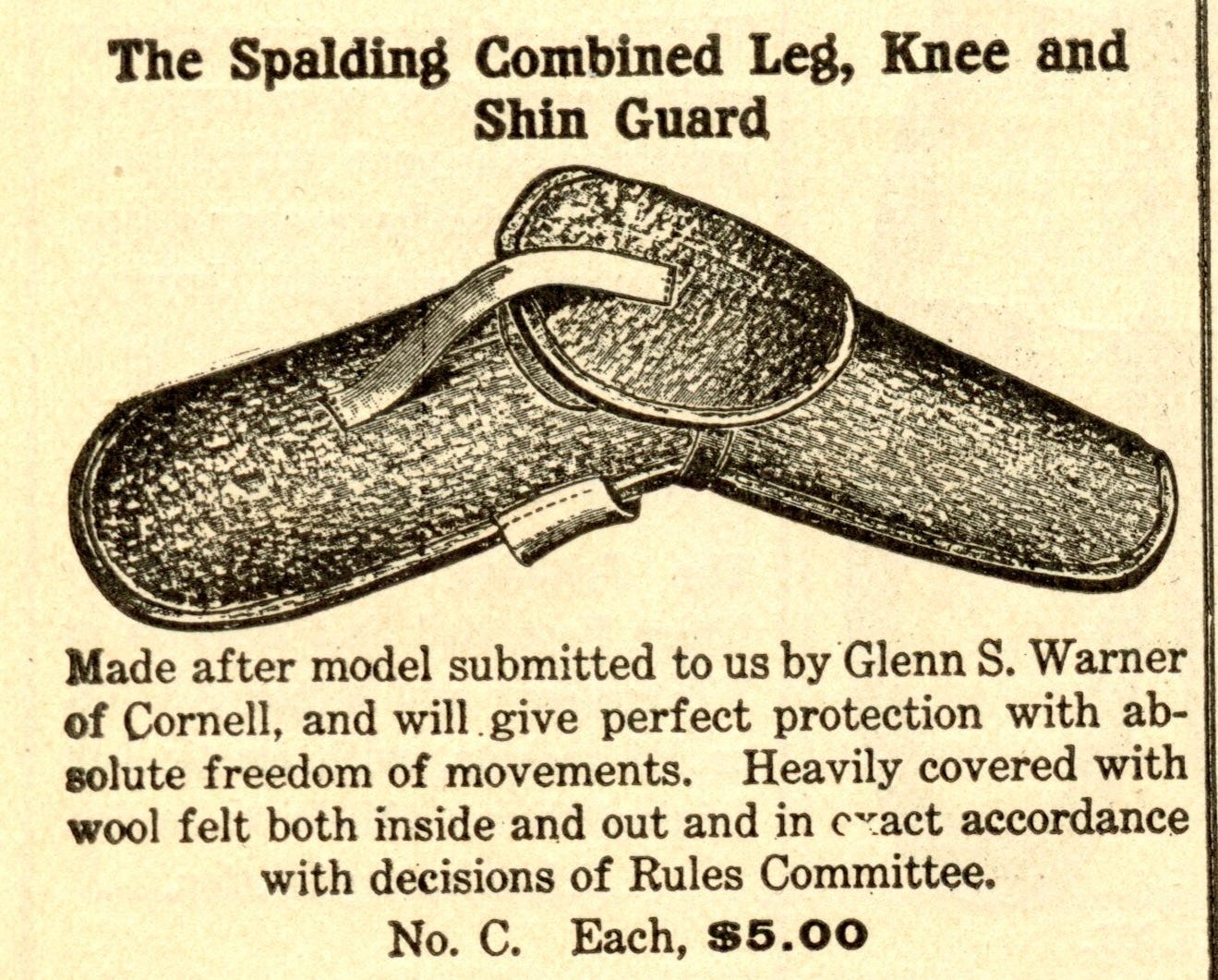 Presumably, you could acquire similar thigh and knee versions, though Spalding did not offer them in their 1905-06 catalog. Instead, they had the Pop Warner-designed combination pad, which covered the thighs, knees, and shins for $5 each. Outfitting a player in unpadded pants and a pair of combination pads ran $14, far more than the reeded moleskin pants and top-of-the-line shin guards, which retailed for $6.75 combined.
