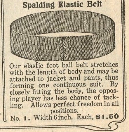 The elastic band solved the pants-grabbing problem until football pants evolved in the late Teens with the addition of extensive padding on the upper hips and kidneys.