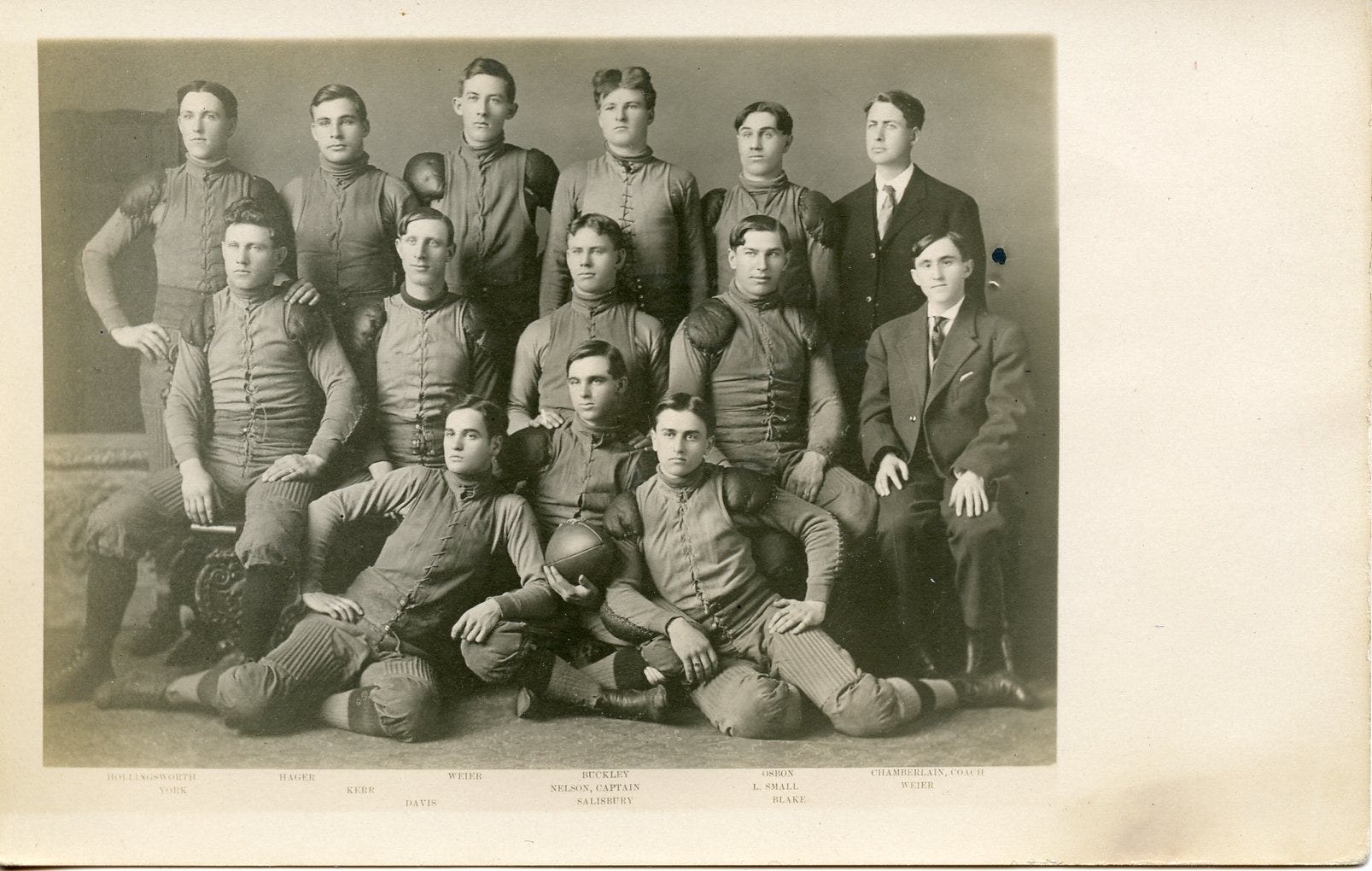In the 1905 era, football players often wore outfits that resembled union suits: a colored long-sleeve jersey, a canvas vest, and canvas or moleskin pants to the knees. Wool stockings to the knees, black shoes, and shin guards completed the outfit. Many players and teams skipped the vest, but the union suit was among the standard looks of the day.